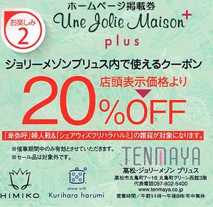 秘密!ジョリーメゾン割引券 2018年1月17日 by ijima お知らせ中の丸亀町レッツホールでの展示会の当日、丸亀町グリーンのジョリーメゾンさんで使える20%OFFの割引券を当店で配布します。これは、外商お得意様だけの特別券ですが、このブログを見た方だけに当店で配布いたします(秘密で・・・)「卑弥呼」の婦人靴、「シェアウィズクリハラハルミ」の雑貨、のプロパー品(セール対象外商品)も期間限定で20%引きになる特別な券です。昨日のブログの肉券と一緒にお渡しします(´∀`)
