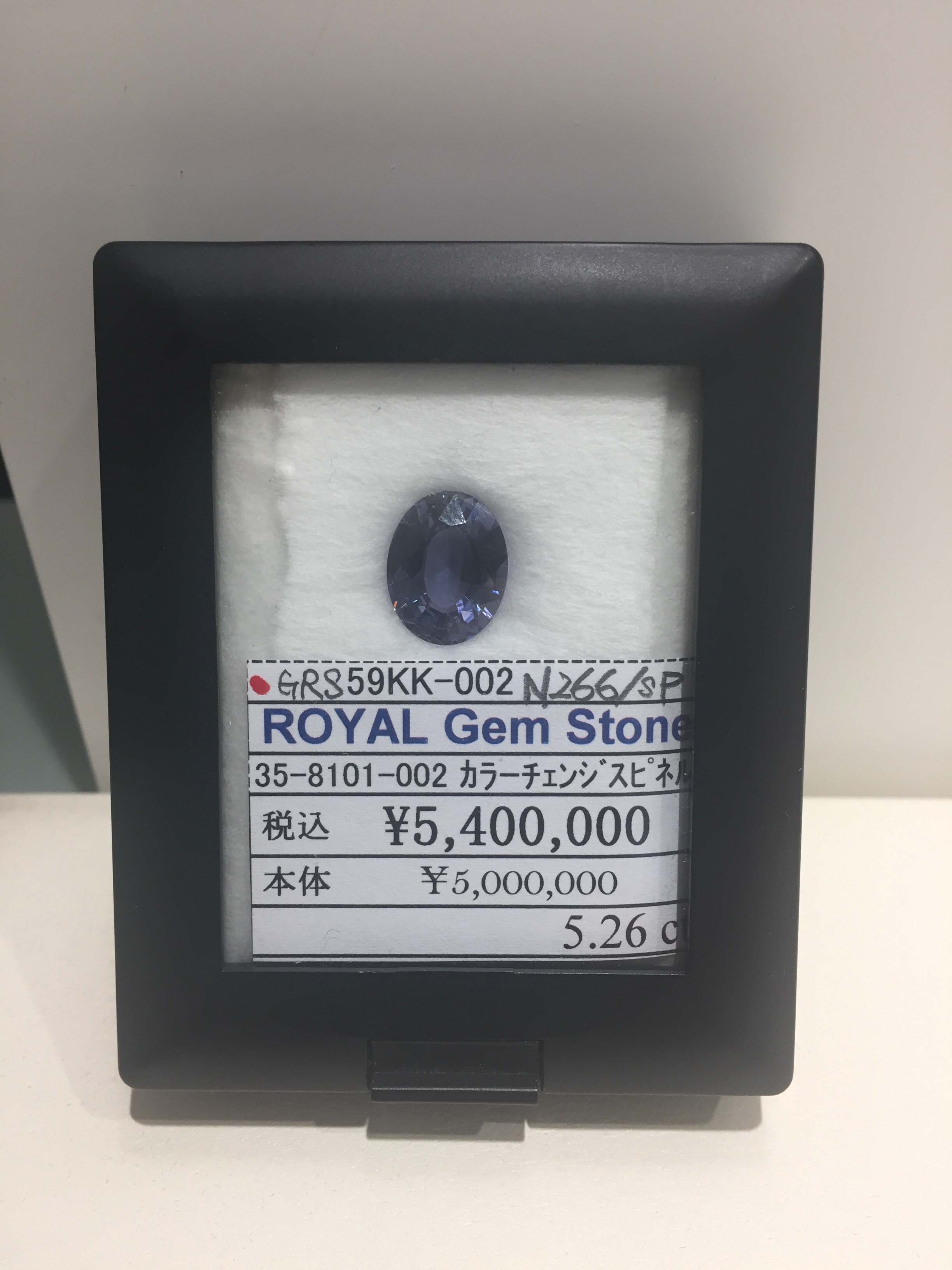 ルビーと似た深紅の「レッドスピネル」が有名ですが、ブルーのスピネルも稀に産出されます。一般にはサファイアのブルーには及ばないが、中にはビルマサファイアと見間違うほど素晴らしい色相のブルースピネルがあります。ブルースピネルの遷移元素は、鉄や稀にコバルトの混入によるようです。写真のスピネルは、自然光と白熱光で色が変化する「カラーチェンジスピネル」で非常に希少価値が、ある逸品です。