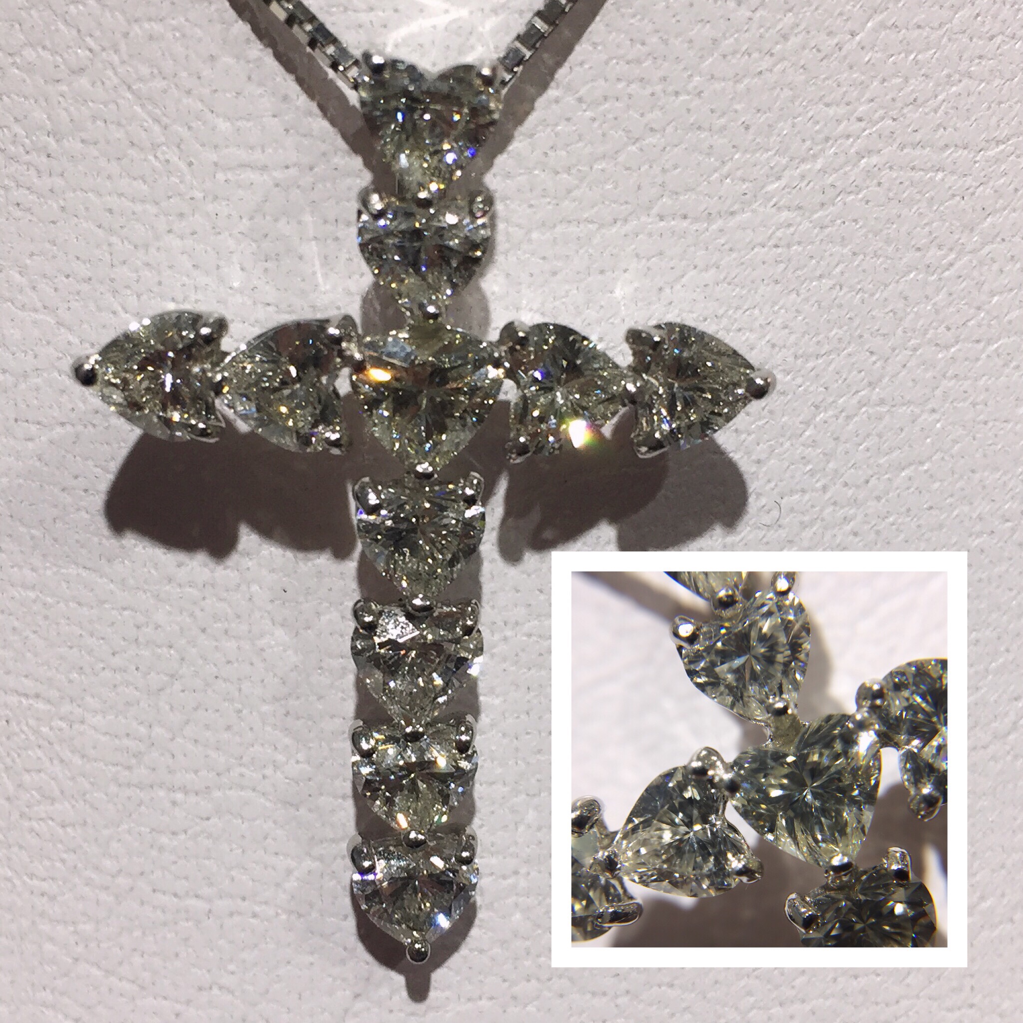 ハート型ダイヤペンダント 2018年2月27日 by ijima ハート型 ダイヤペンダントのクロスモチーフのペンダント。 ハートカットのダイヤモンドを11ps使用して、クロスデザインに製作した一点物。 Pt枠に 4.50ct ダイヤペンダント入り 決算特価で税込100万円