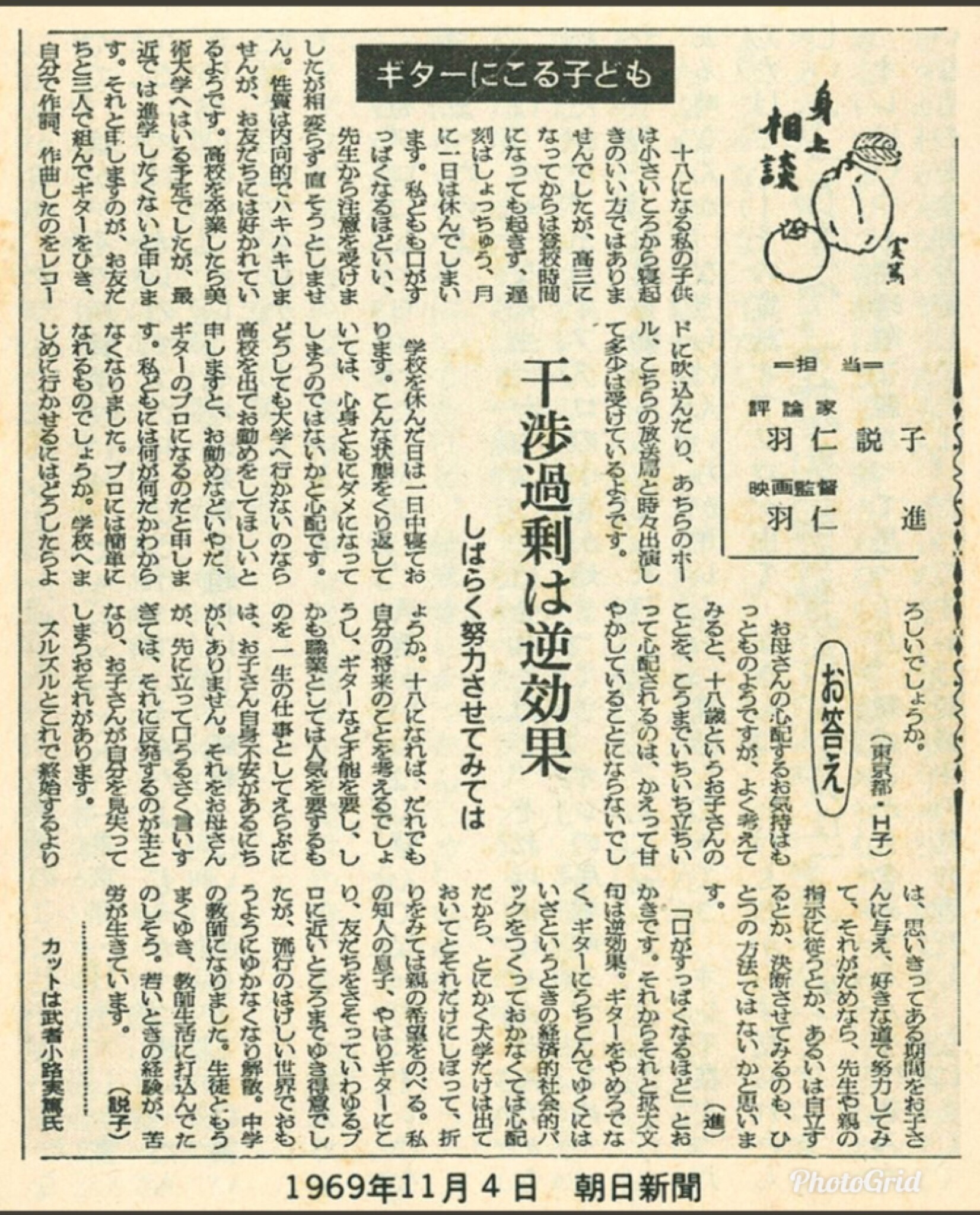 今、ツイッターで話題になっている、ギターばかり弾いていた忌野清志郎さんが高校生のときにお母さんが心配して朝日新聞に相談した記事です。回答した羽仁先生のおかげで偉大なロックスターが生まれました。この時代にこんな解説でお答えになられた先生を素晴らしいと思います。私の息子が同じ境遇なら、こんな対処は今でもできないと思う。