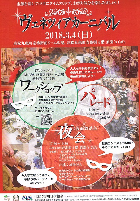 本日!「ベネツィアカーニバル」開催 2018年3月4日 by ijima 本日3月4日(日)高松丸亀町にて「ヴェネツィアカーニバル」が開催されます。素顔を隠して中世にタイムスリップ( ´艸`)ムププお祭り気分を楽しみませんか?17:30~19:30 高松丸亀町 壱番街 4階「菜園’S Cafe」にて仮面舞踏会の夜会に是非、ご参加ください。ワンドリンク・仮面付き で一般(高校生以上)は2,000円、小・中学生は1,000円、小学生未満は無料です。