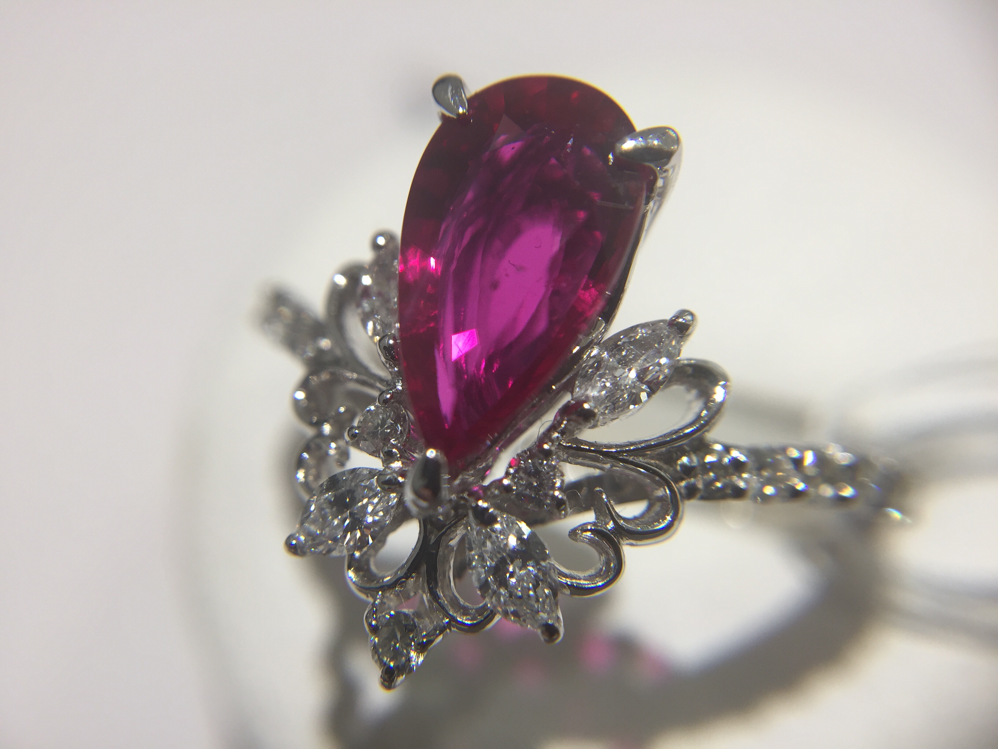 60万円均一❽ 2018年4月11日 by ijima ノンヒート(非加熱) ペアシェイプ型 ルビーリング (プラチナ枠 1.290ct 0.36ct) 透明感もあり、傷も少ないキャラアップのノンヒートルビーで大変、希少品です。 600,000円