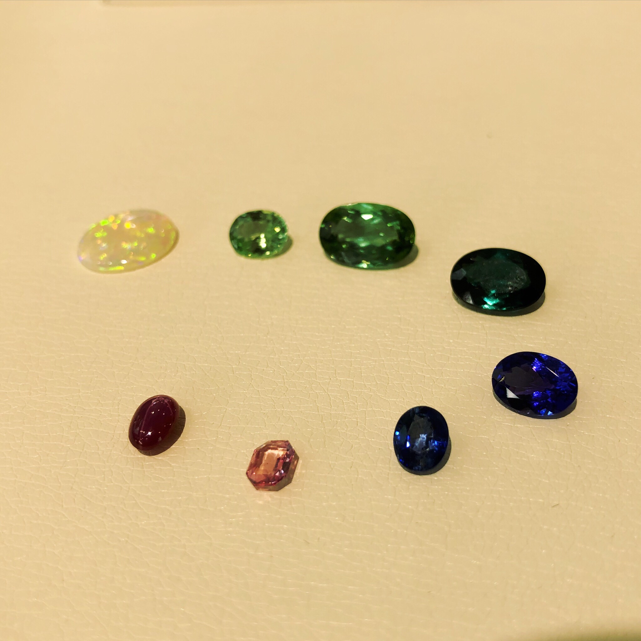 左上のオパールから時計回りにグリーンガーネット、グリーントルマリン、グリーントルマリン、タンザナイト、ブルーサファイア、パパラチアサファイア、スタールビー