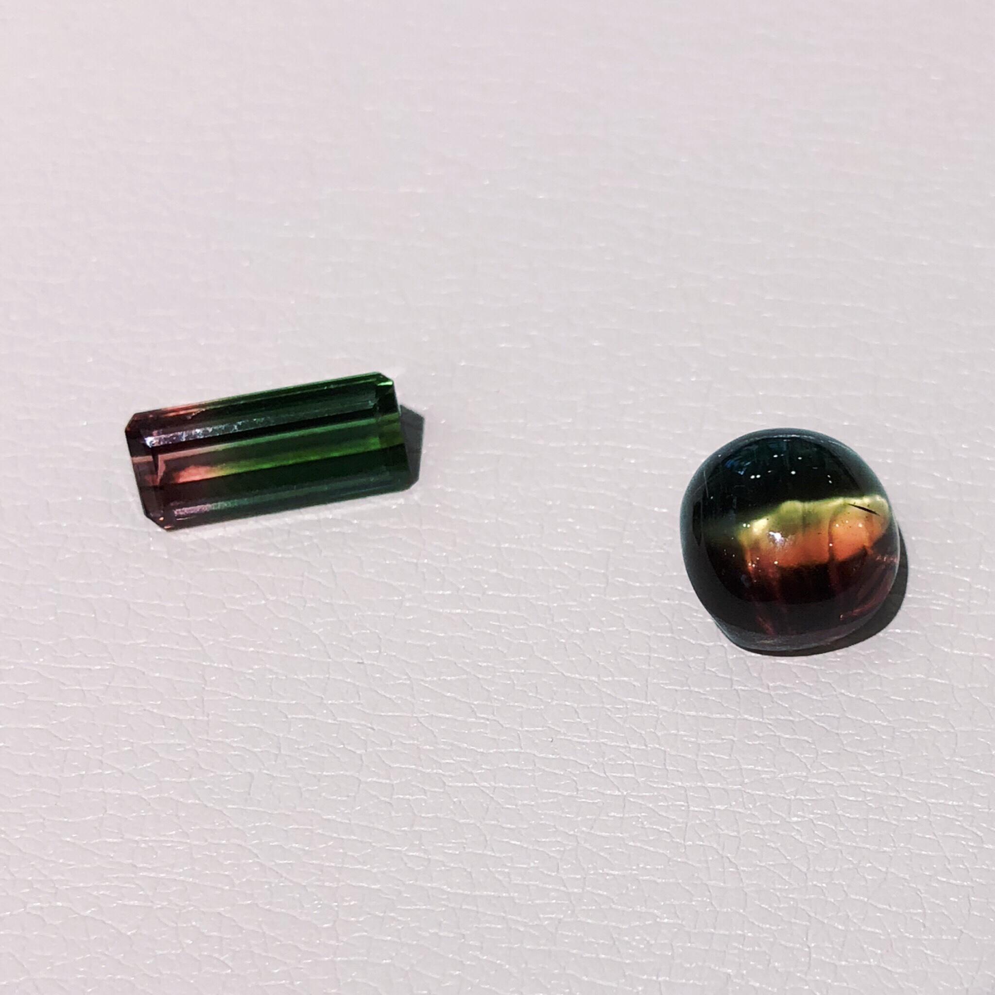 左は、2.96ct 角型ですから、スッキリとしたシンプルなジュエリーに加工したいですね。右は、キャッツアイ効果があるパートカラートルマリンです。非常に綺麗で珍しいので、指輪にしていただきたいです。