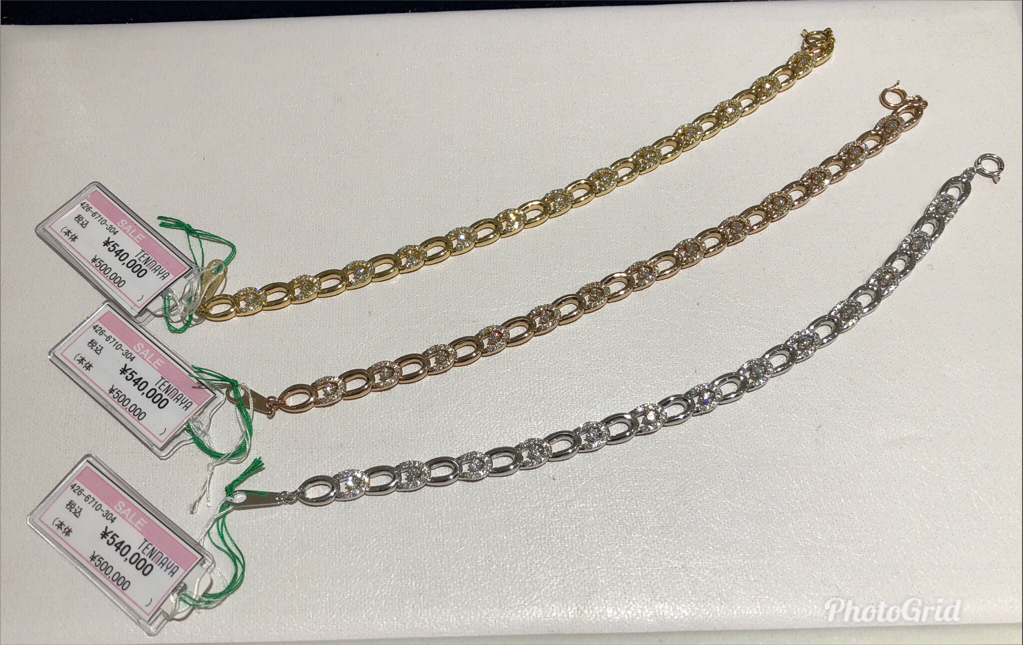 春の陽気になり、手首が露出される季節到来です。ダイヤ入りブレスレットはいかがですか?ダイヤモンド 1.47ct入り、最新作、イエロー、ピンク、ホワイトゴールドの3種類を各一本づつ仕入れしました。