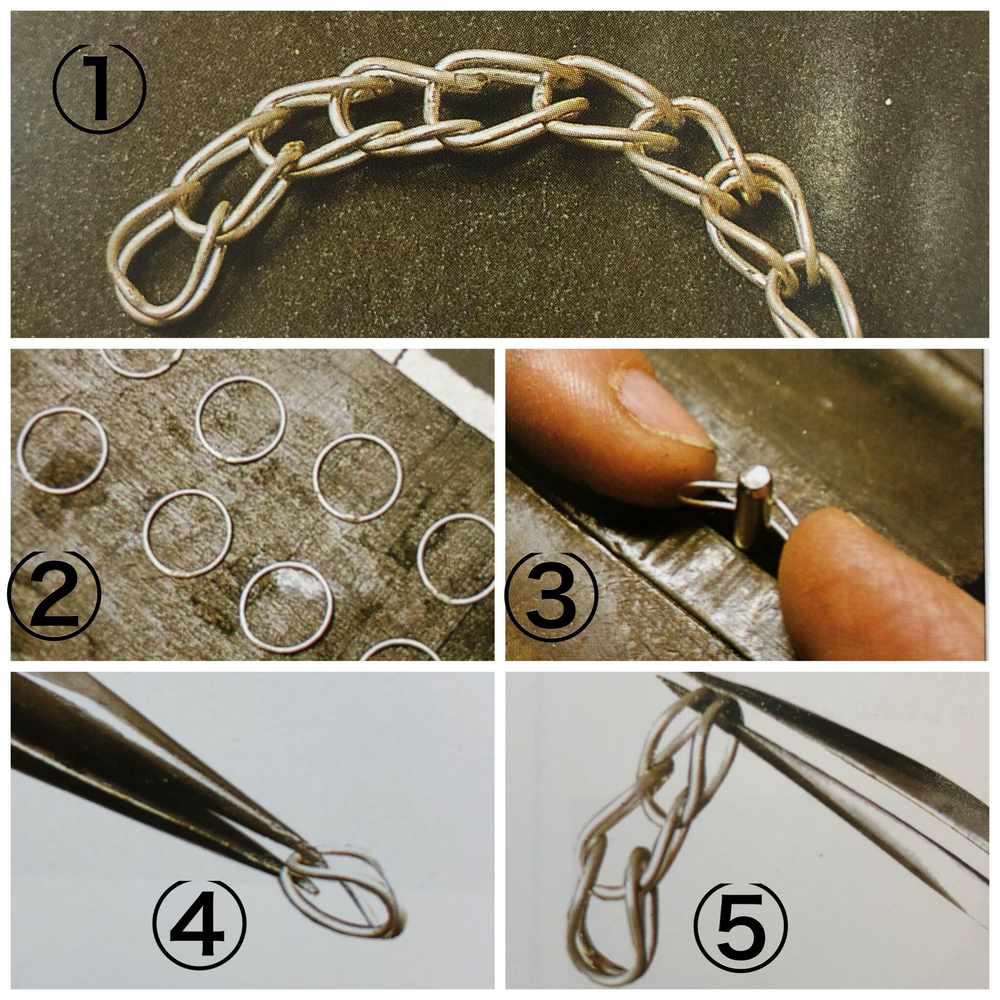 ②楕円パーツは円形のパーツをロウ付けした後に丸ヤットコな先端にはめ、ヤットコを広げて横に伸ばします。