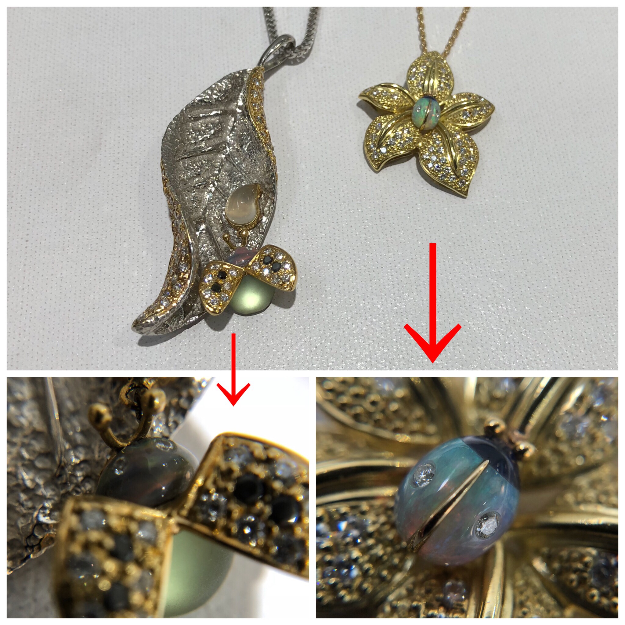 両方とも、オパールにダイヤモンドを埋め込まれています。オパールは非常に割れやすく、タガネ使用にも細心の技術が必要とされます。