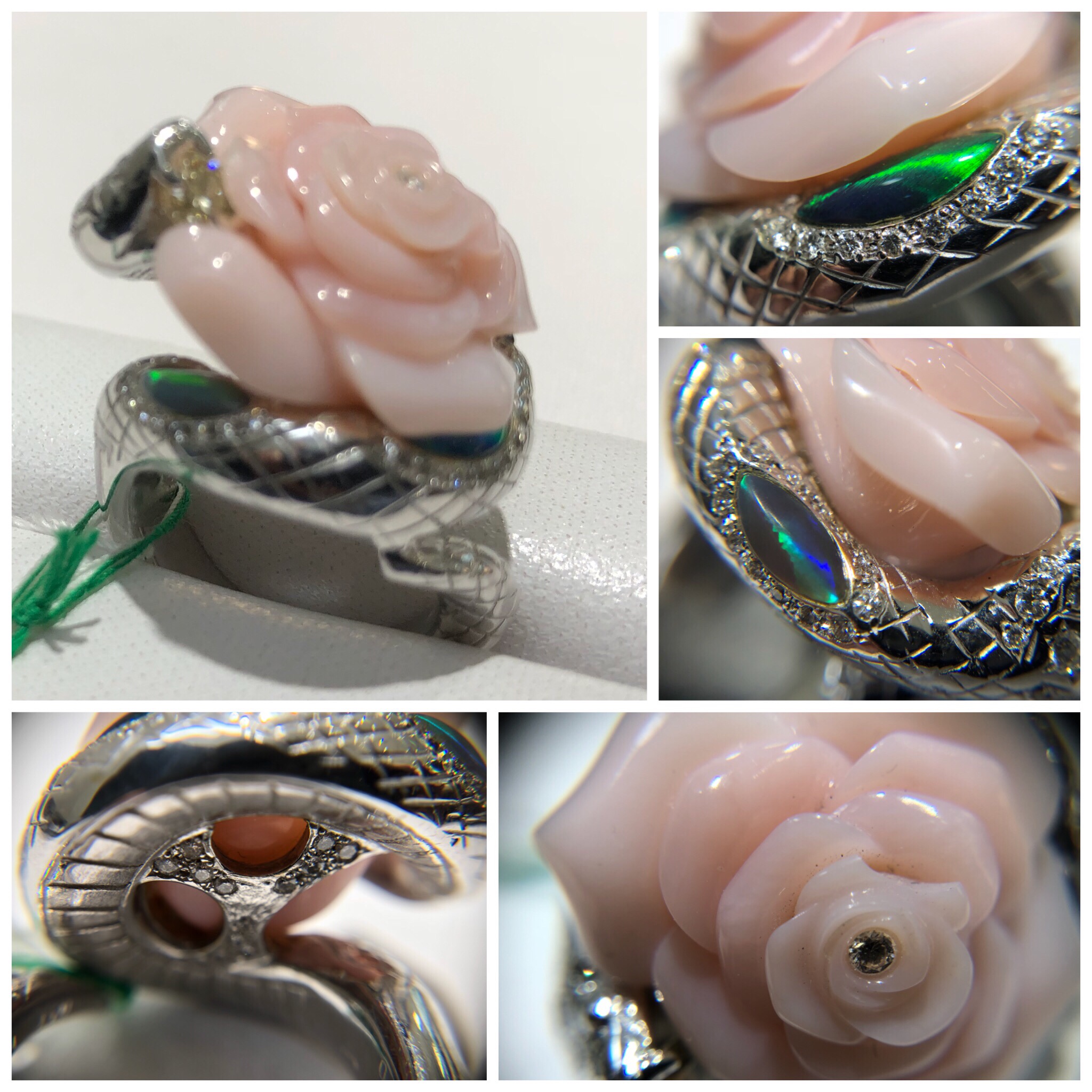 カービングとは、石をそのまま原石の状態から彫ったり削ったりしてカットし、形状を作り上げる技法です。ピンクの薔薇は、ピンクオパールを使用しています。その周りを巻くのは、ブラックオパールを象嵌された蛇。