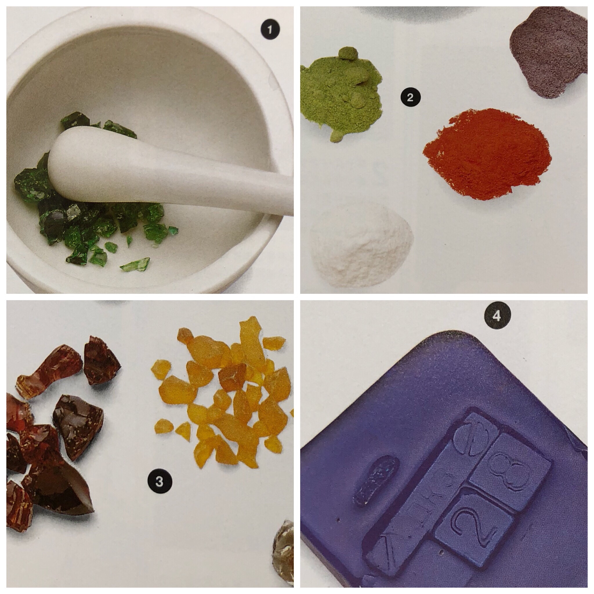 ① 磁気の乳鉢と固形エナメルとすりこぎ。