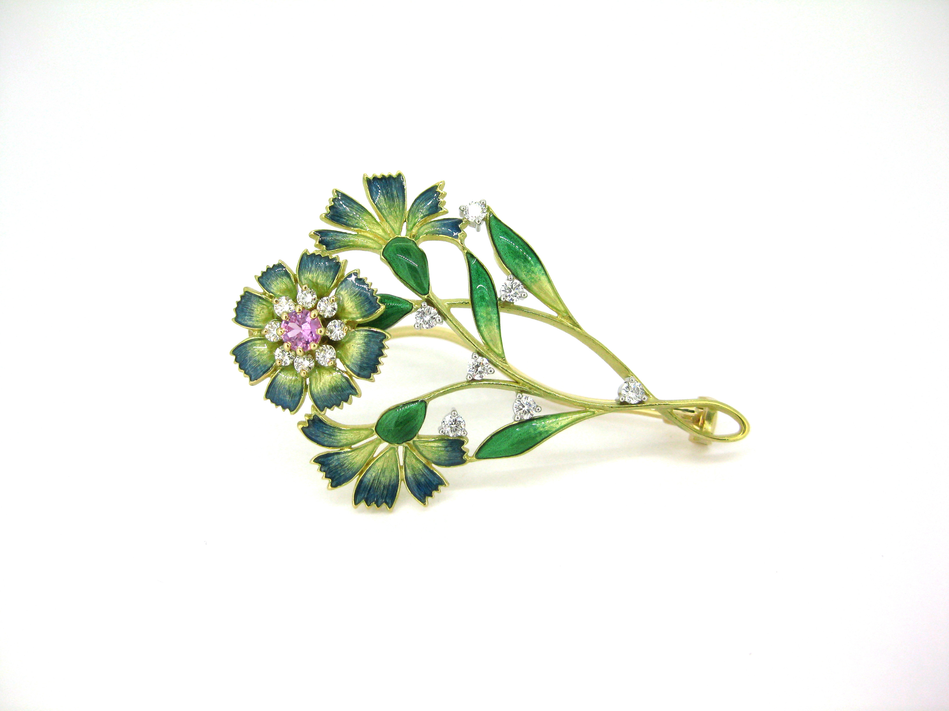 彫金七宝(バスタイユ) 2018年6月15日 by ijima フランス語で「浅浮き彫り」の意で、これは金属の表面を浅浮き彫りで装飾してから透明エナメルを施すことに由来しています。この装飾は彫りの深さの違いに応じてエナメルの色に濃淡が生まれます。透明なカラーエナメルが、背景の装飾と美しく溶け合うからです。