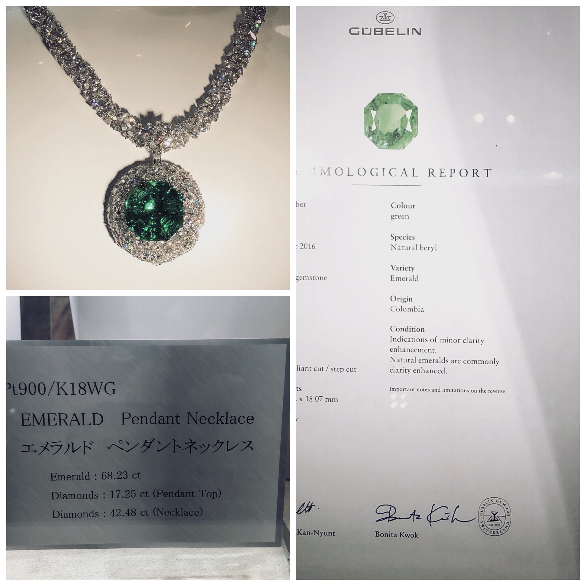 先日の東京ロイヤル会のメイン入り口に堂々と展示されていた、コロンビア産エメラルド 68ctのペンダントネックレス。