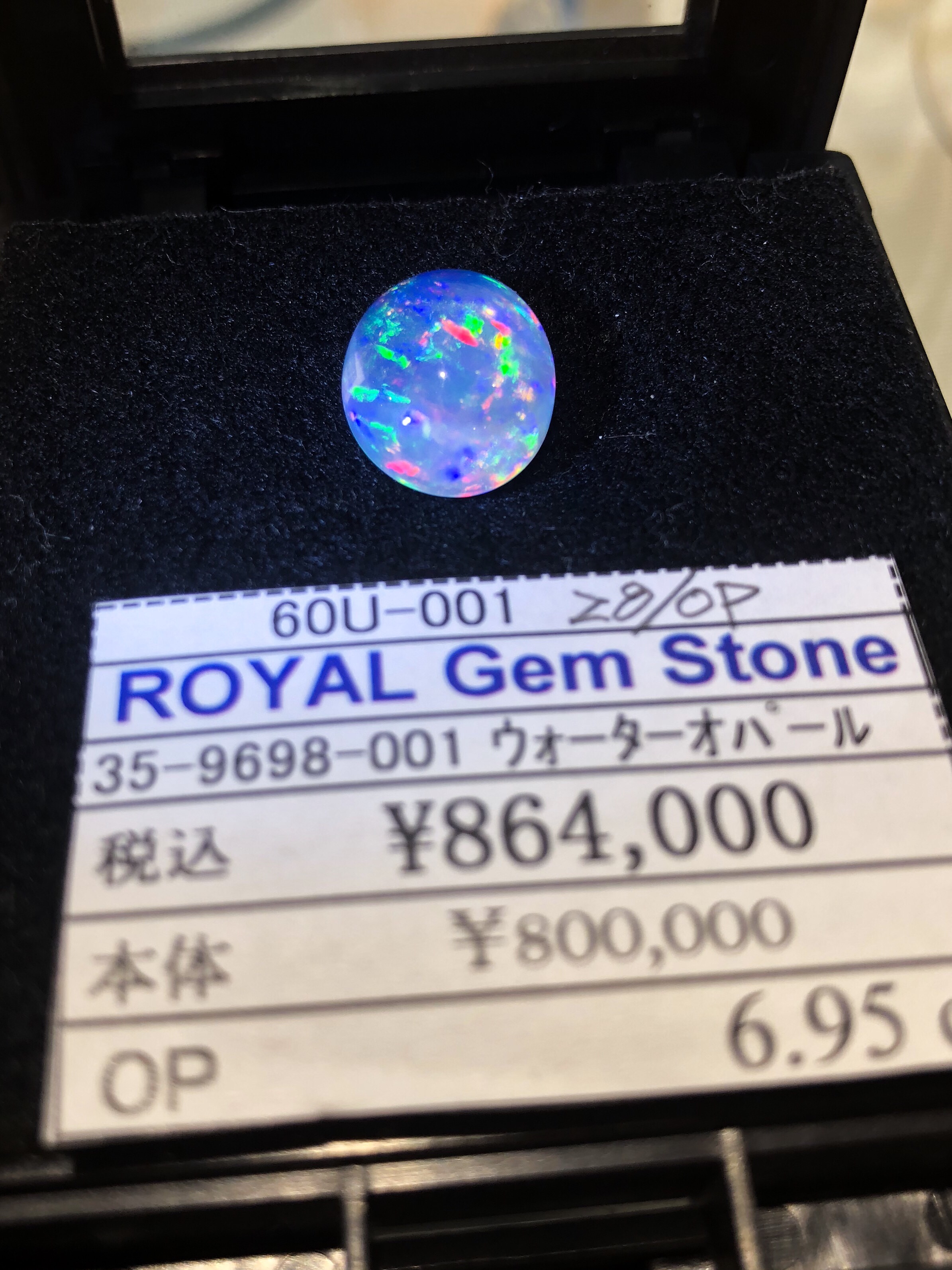 6.95ctで肉厚で、こんもりと丸く、型もいいです。色は写真ではわかりづらいですが、透明度が素晴らしく、いろんな遊色があらわれます。