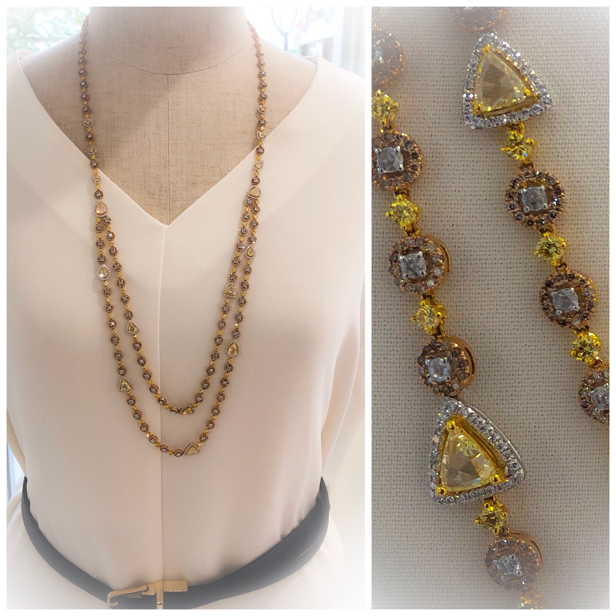 イエローダイヤモンドをイエローゴールドで仕上げた二連のロングネックレス。