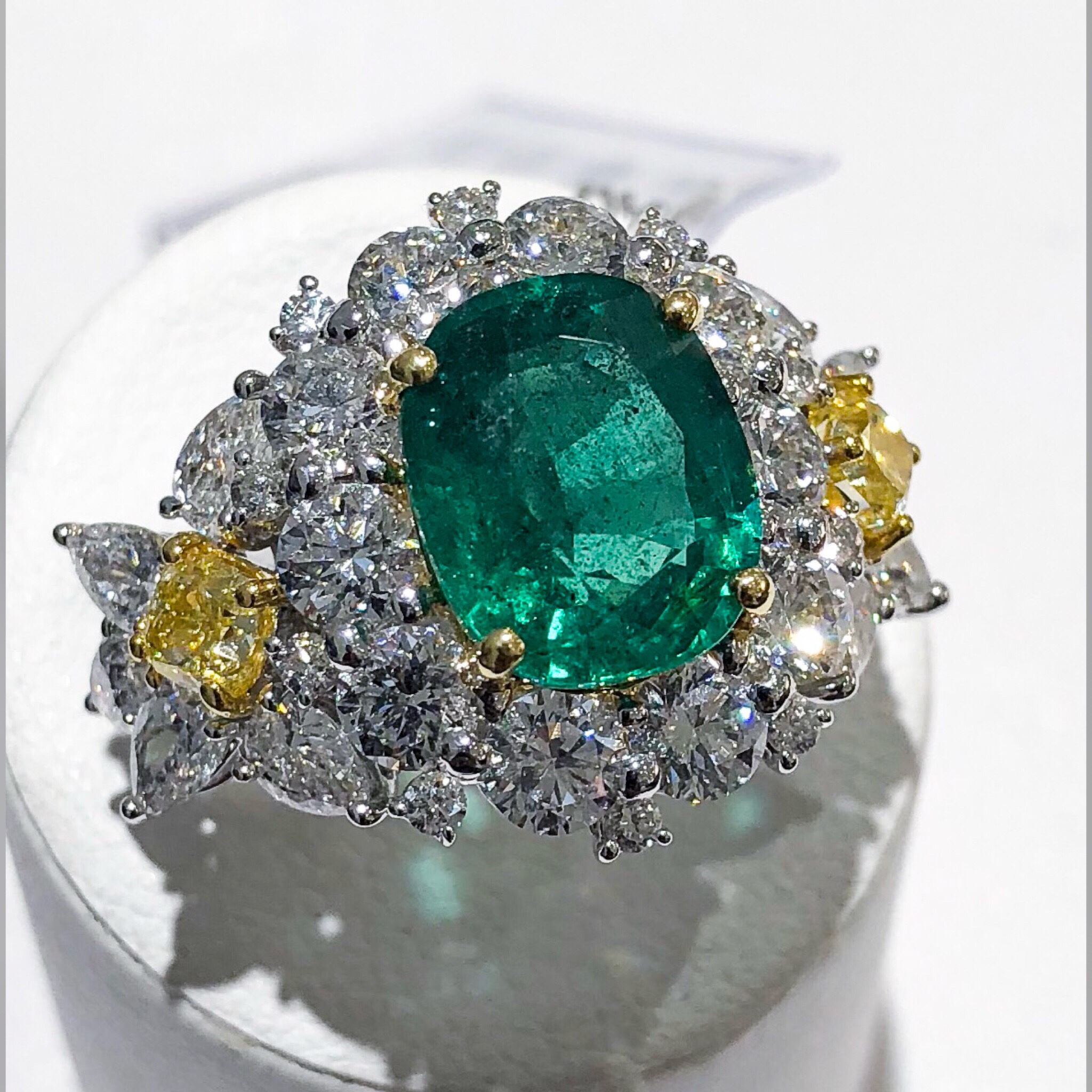 中石のエメラルドはオーバル型で、4.00ctの一級品です。装飾ダイヤの中にビビッドイエローのダイヤモンドを両肩に一粒づつ装着することにより、幅と奥行きを与えて、さらに大粒に見えてボリュームたっぷりである。
