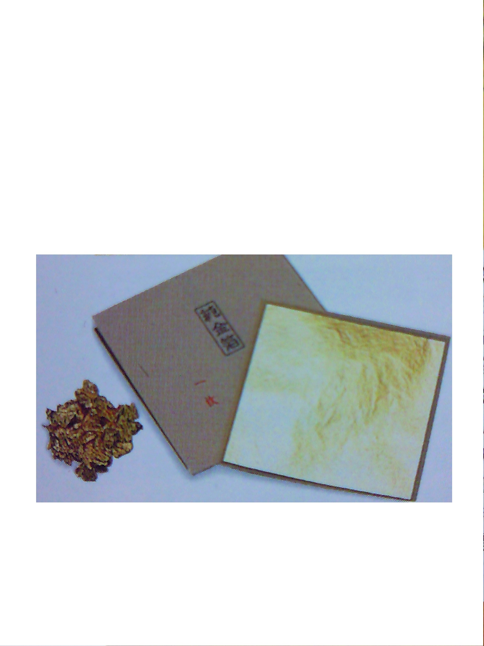 金は、非常に柔らかい性質をもちます。専門用語では、展性(てんせい)、延性(えんせい)に優れているといいます。まず、延性とは、引き伸ばしができるということです。1g の純金を線に引き伸ばすと太さ 5ミクロン(1mmの1000分の1)で、2800m の長さになるのです。ちなみに、人間の髪の毛は 60ミクロンです。この性質を使って、半導体の配線に使用される「ボンディングワイヤー」は、線の直径が25ミクロンで、1巻で2000mあります。さて、展性は、展開の語の展で、一定の重さの金属がどれだけ広げられるか、つまり、薄い板状にできるかの性質をいいます。展性でいうと、純金の場合、1gで、約畳3分の1くらいの大きさに広げることが出来ます。厚みは、0.1ミクロン(1mmの 1万分の1)の厚さです。これを利用した、ふつう販売されている金箔は下の図の11cm×11cmです。