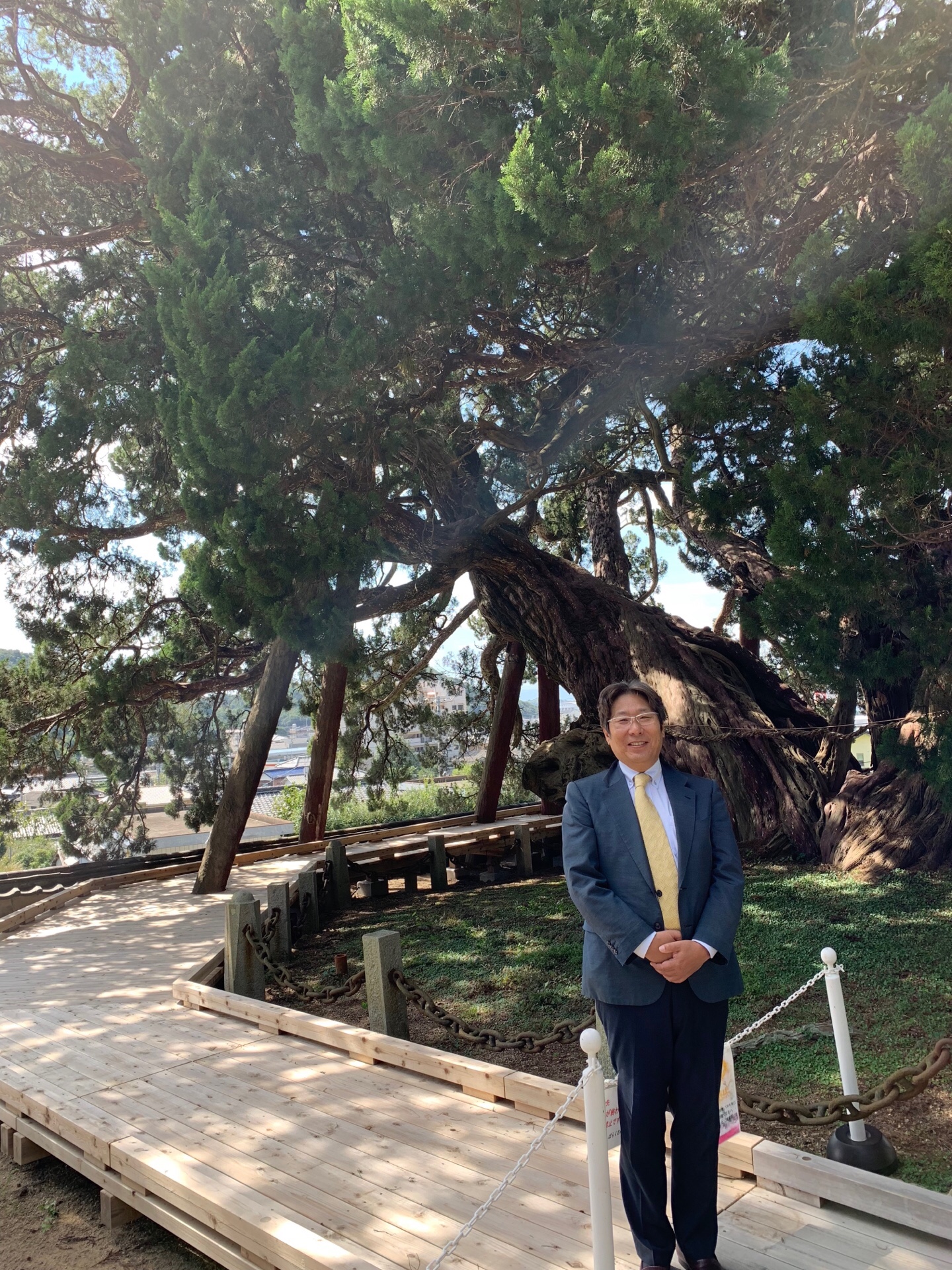 小豆島八十八ヶ所霊場 54番札所 「宝生院」の境内に、応神天皇がお手植えになったとされる樹齢1600年を超える日本最大の真柏(シンパク)があります。地元の保存会の働きにより、手厚く守られてきました。この度、360°の方向から見えるように観覧通路が完成しました。真柏は、人間の手が触ると火傷してしまうので、手が触れられないようになりました。真柏の龍神様は私も信仰していて、小豆島に来たら必ず手を合わせに行きます。昨日は、龍神様が喜んで写真に写り込みました。