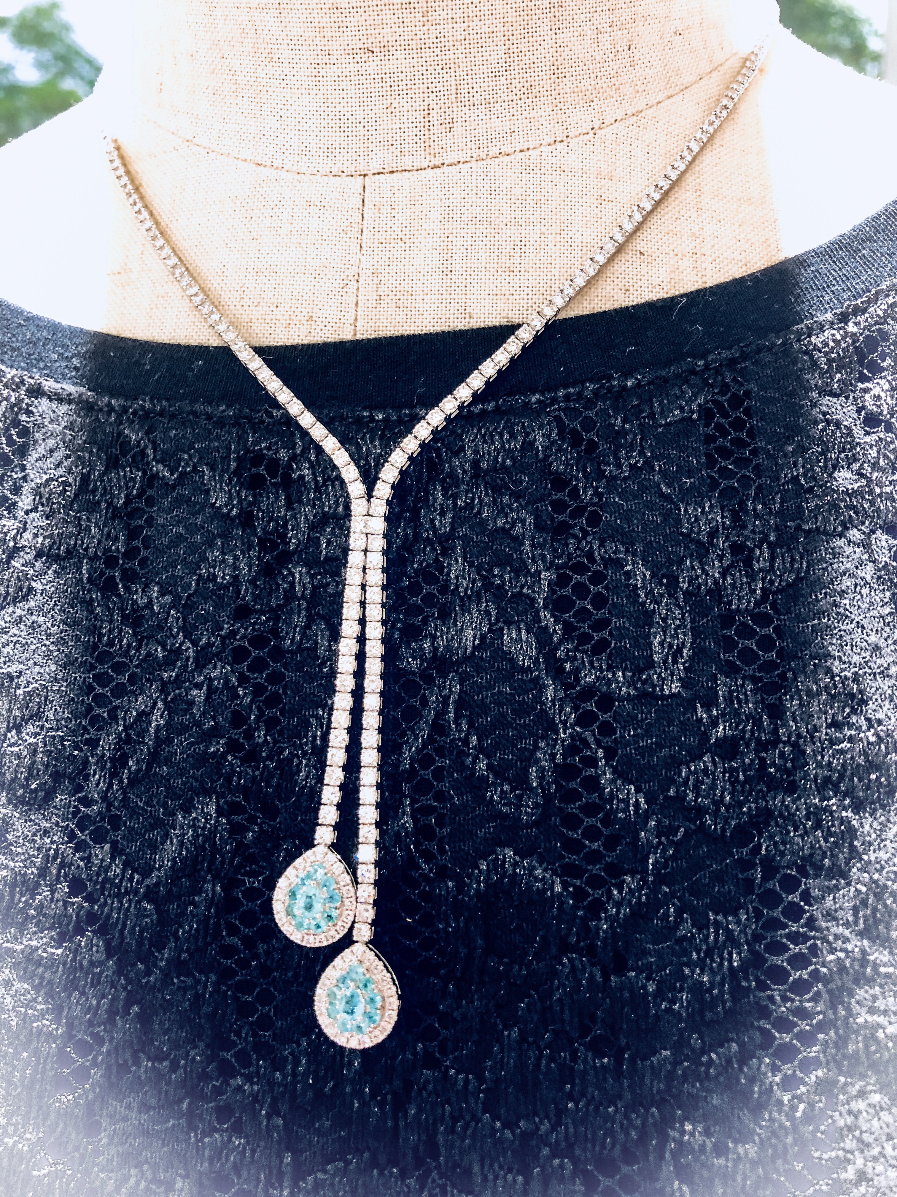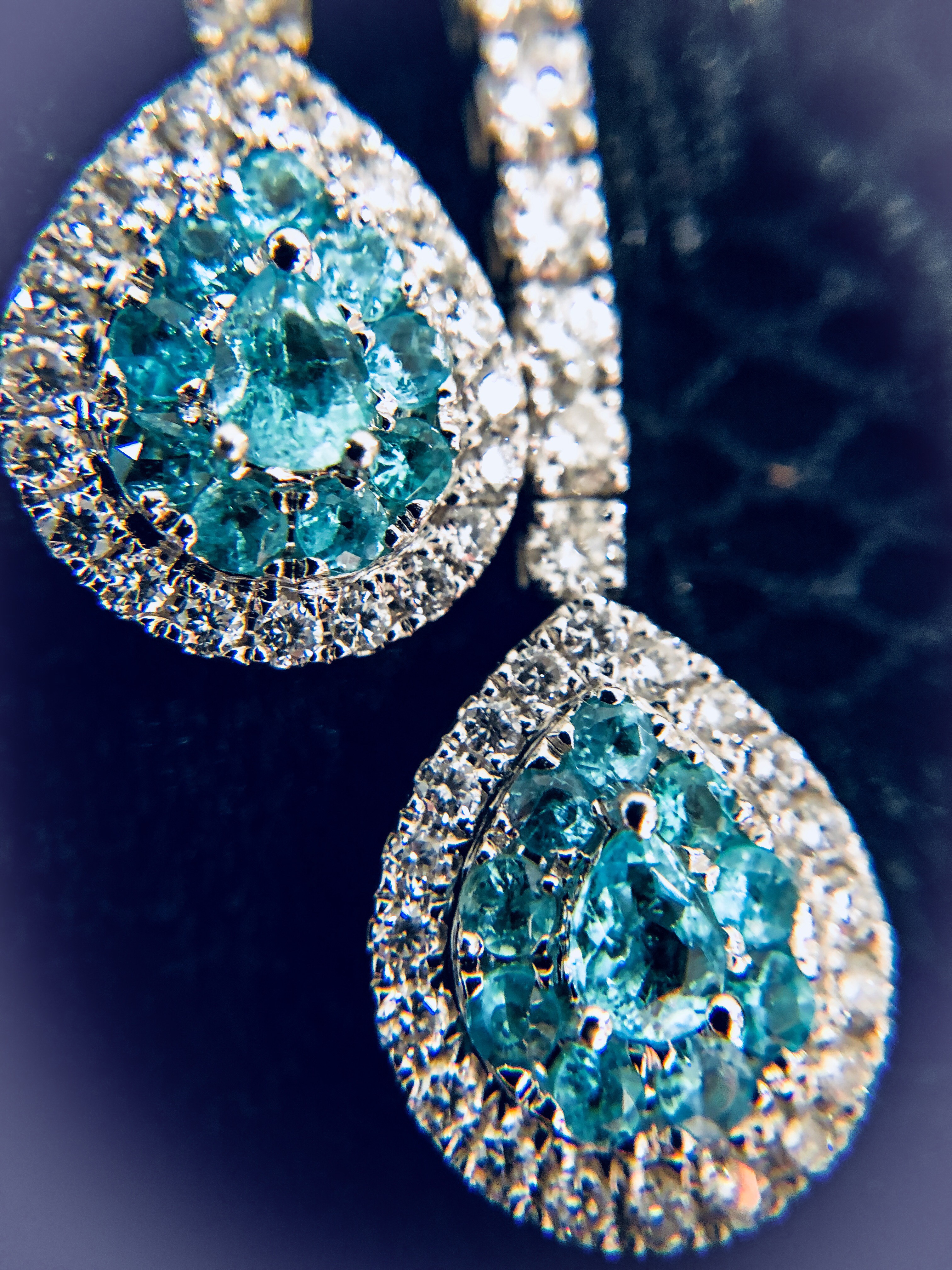 パライバトルマリンペンダント 2018年10月13日 by ijima エクレブがやってくれました。高級すぎて手が出なかったパライバトルマリンをメレ石と小粒の石を合わせて、大きなパライバトルマリンの中石に見えるようにセッティングしました。 写真の拡大は5倍程度、大きくしてありますが、肉眼で見ると私も一粒の大きなパライバトルマリンに見えました。 ダイヤモンドのネックレスも柔らかく仕上がっていて、ブラウスに気軽にご使用いただける作品となっています。 パライバトルマリン 0.60ct ダイヤモンド 4.25ct 定価 2,592,000円