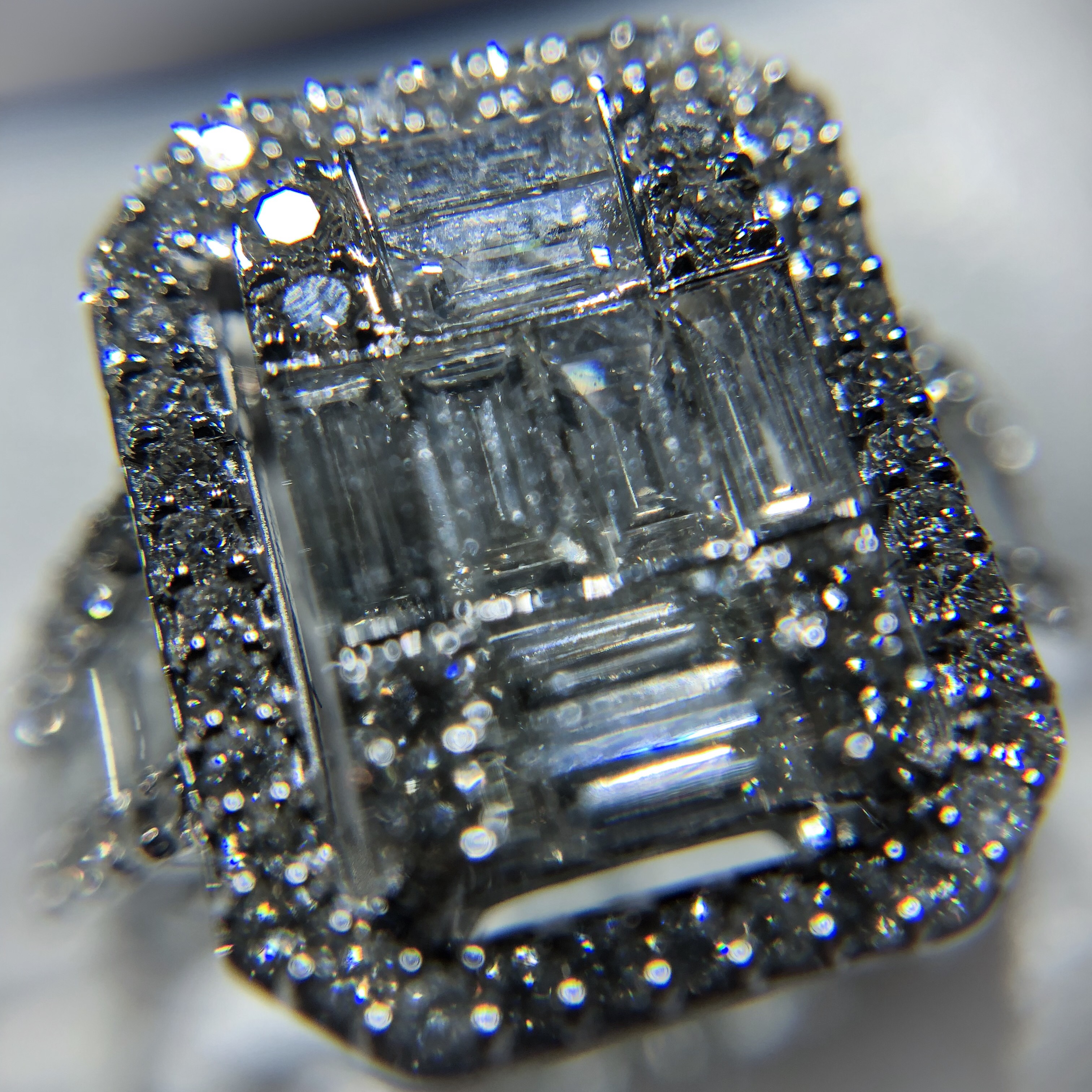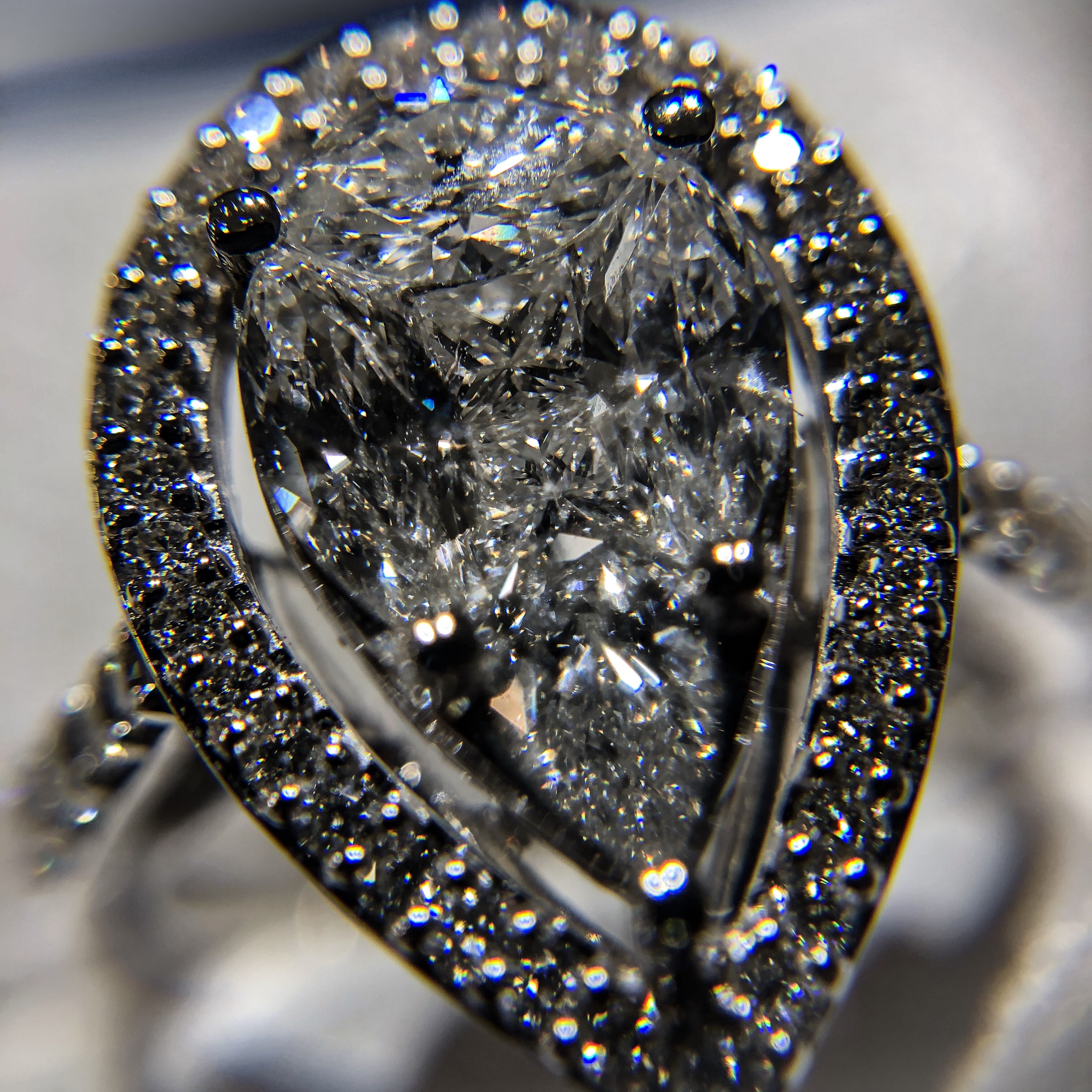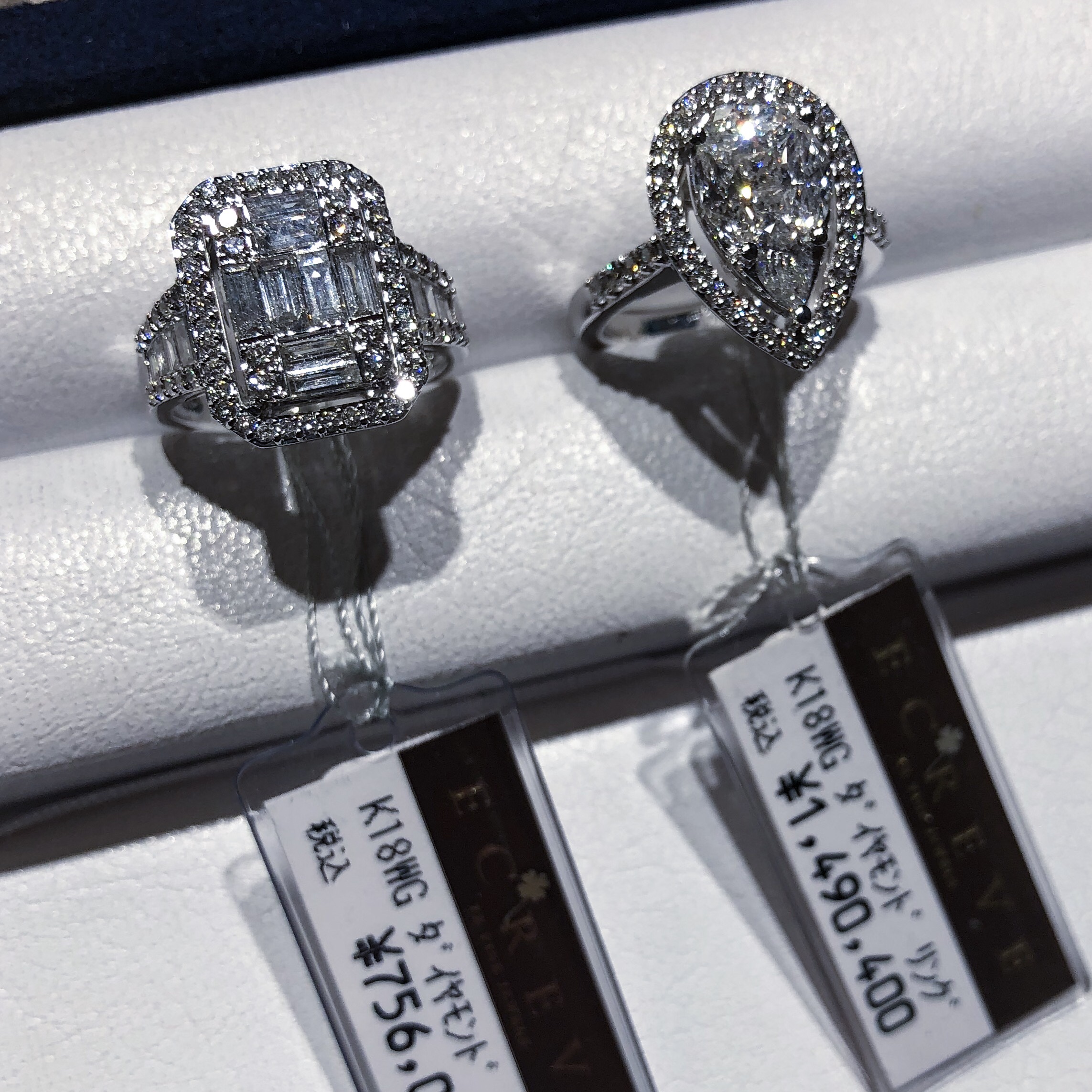 エクレブダイヤリングⅡ 2018年10月15日 by ijima エクレブの定番ダイヤセッティングリングの新作です。 角ダイヤは昨年に発売されて、リングだけでなく、イヤリングやペンダントも大変な人気で売れ続けました。 今年はペアシェイプ型(洋梨型)のラインナップが追加されました。拡大写真を観ると技術的に大変なのが良くわかります。 写真右側の 149万円のペアシェイプ型リングの中石は一粒なら5ctサイズ。 一粒石のリングなら、2000万円はします。 今年も、受注待ちの人気商品です。