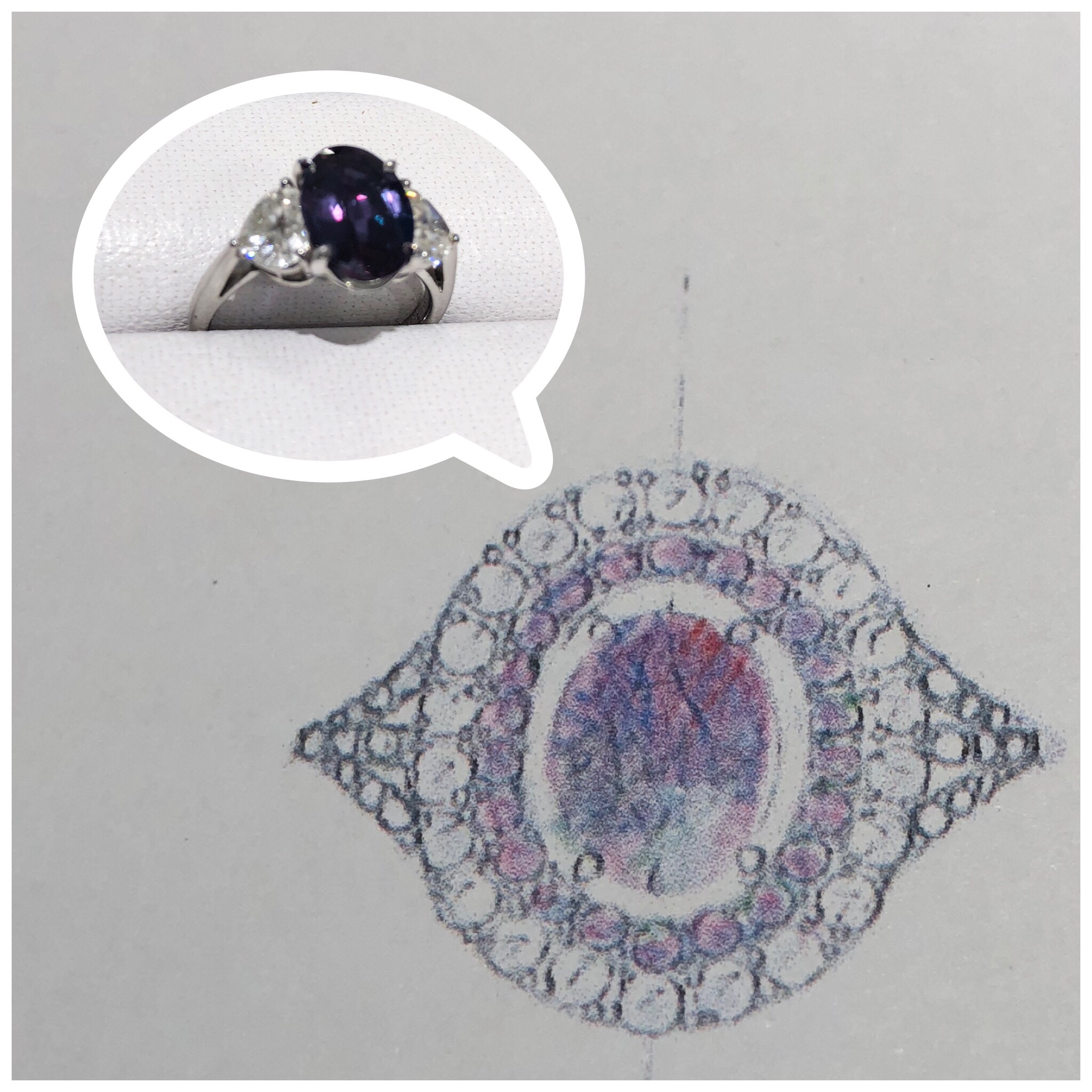 お客様が母から譲り受けたアレキサンドライトのリフォーム相談を受けました。今のままでも十分使用できるデザインなのですが、もっと高級感があるデザインにリフォームしたいとのことで、デザイン画を描いてみました。アレキサンドライトの周りに同じアレキサンドライトのメレ石を少し隙間を開けて配置して、その外周りにローズカットダイヤを取巻きしてみました。
