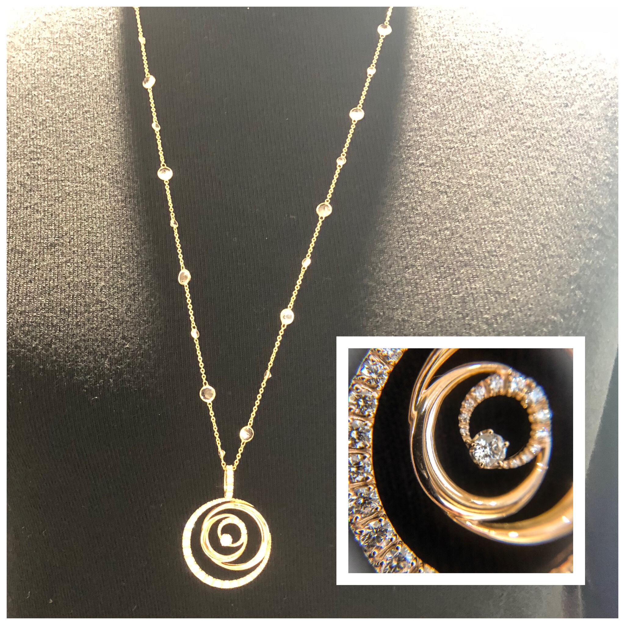 センターにサクラダイヤモンド 0.170ct VS1、そのまわりに、0.92ctダイヤモンドを取り巻き、ロングネックレス部分にはステーション(間隔を空けて)、ホワイトトパーズが、10.02ct配置されていて、高級感があるトレンドジュエリーになりました。
