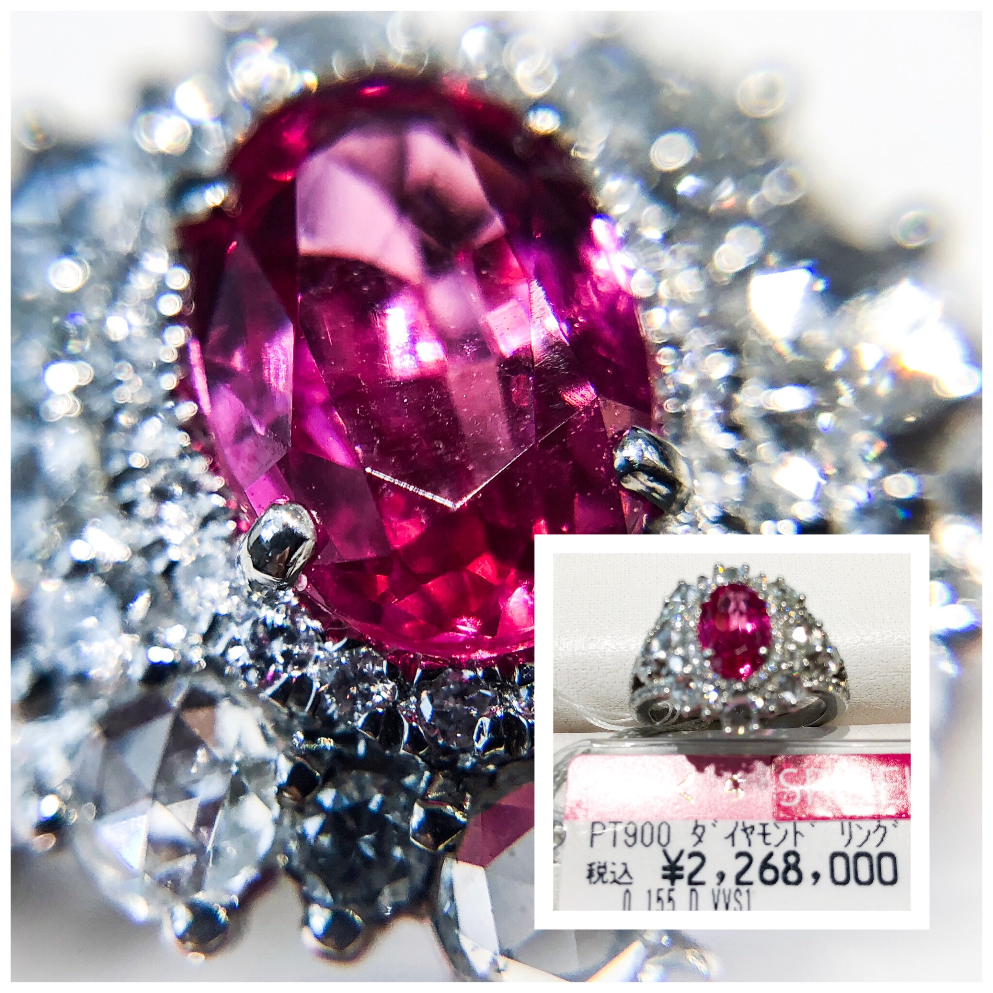 スピネル 1.571ct 、サクラダイヤモンド 0.155ct D VVS1×2ピース、取り巻きダイヤモンド 1.05ct 枠はPT900を使用しています。