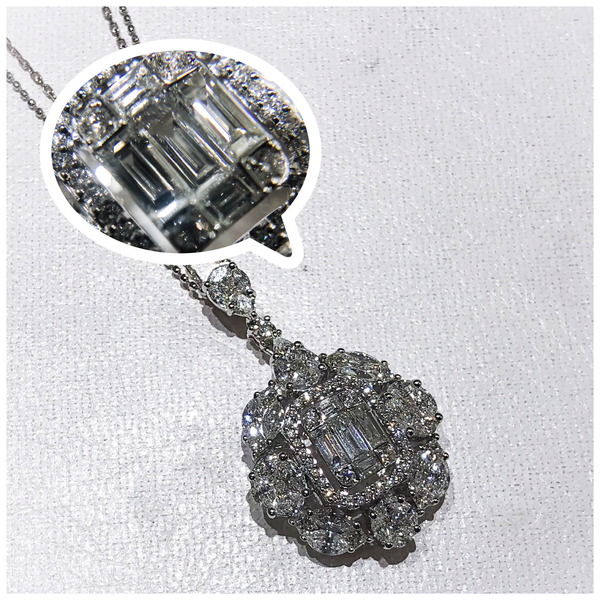 セッティングダイヤペンダント 2018年12月8日 by ijima 装着した見た目は、センターダイヤが5ctサイズに感じます。周りの取り巻きダイヤもマーキスやオーバル型ダイヤに見えるのは、すべて石合わせしたダイヤ。 人気の商品です。 税込 1,188,000円