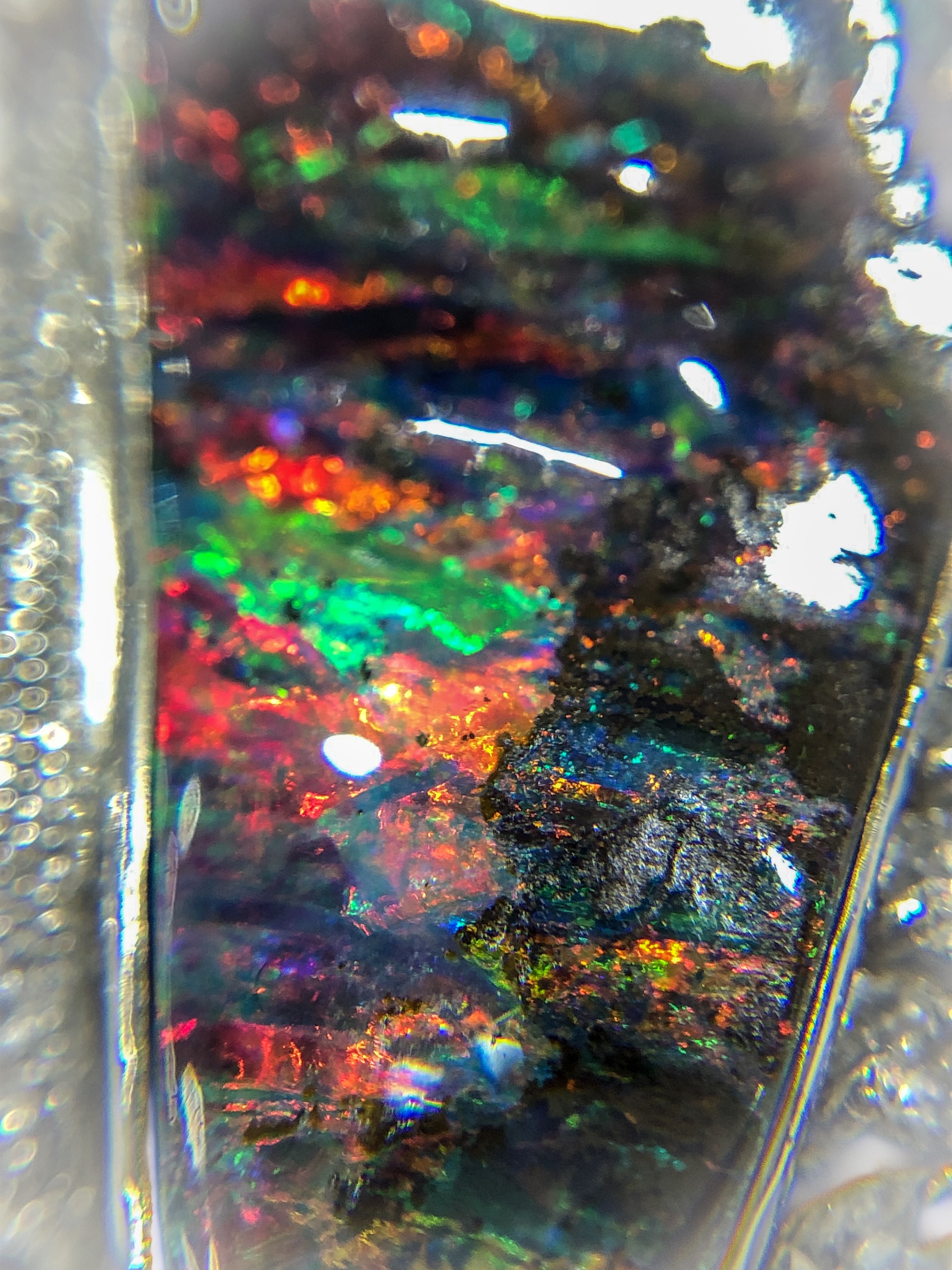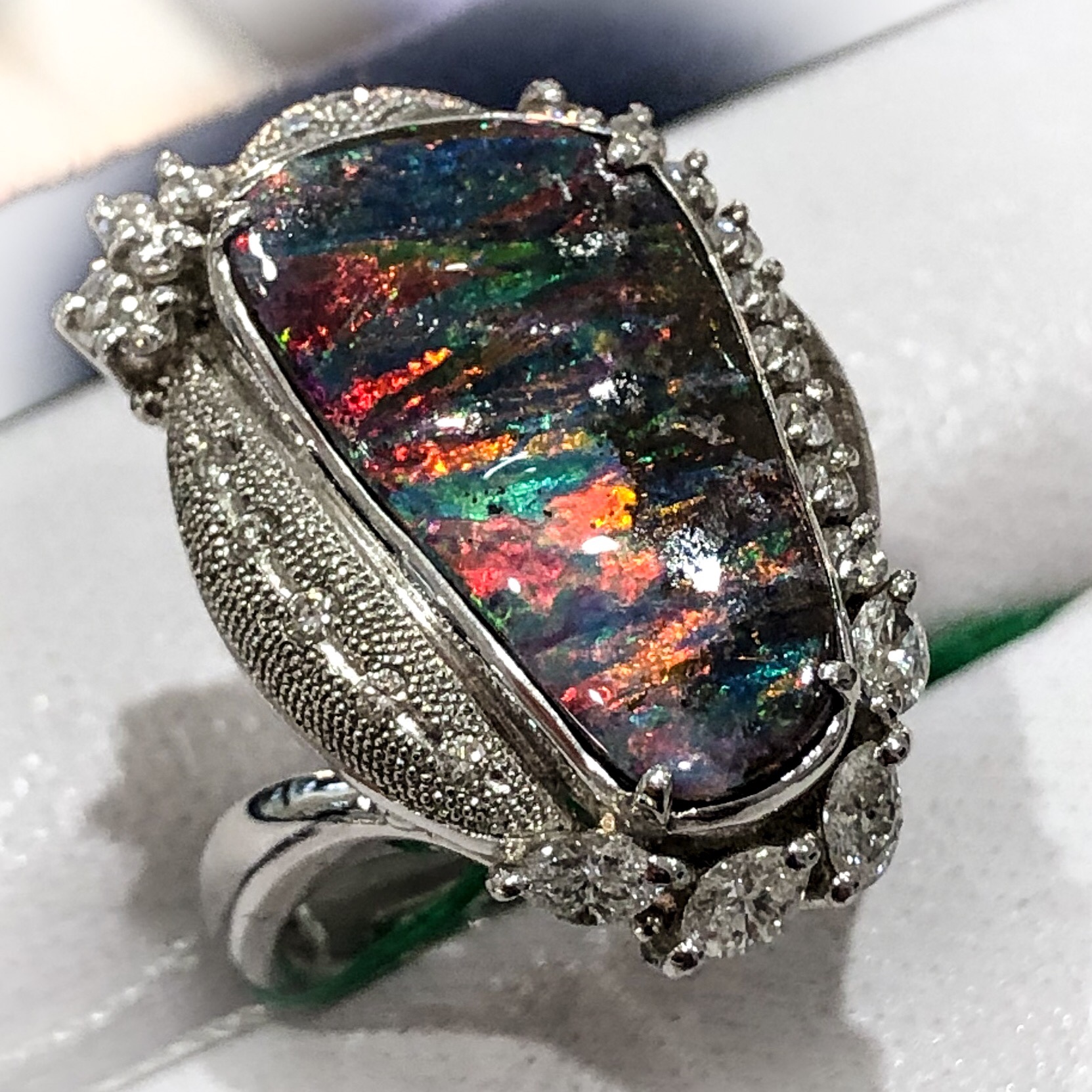 ボルダーオパール① 2019年1月7日 by ijima ボルダーオパールとは・・・ オパールは、もともと岩(母岩)の隙間に沁み入るように結晶成長していく宝石のため、その隙間に薄く形成されている場合が多い。 そのまま、オパールだけ薄く削りとると、ジュエリーにする強度が不足します。そのために母岩ごと、削ってカットします。それをボルダーオパールと言います。 色彩が豊かで、その模様もいろいろなパターンがあり、気に入った石に出会うと心を盗まれる。 写真のリング BO 7.70ct D 0.67ct 200万円