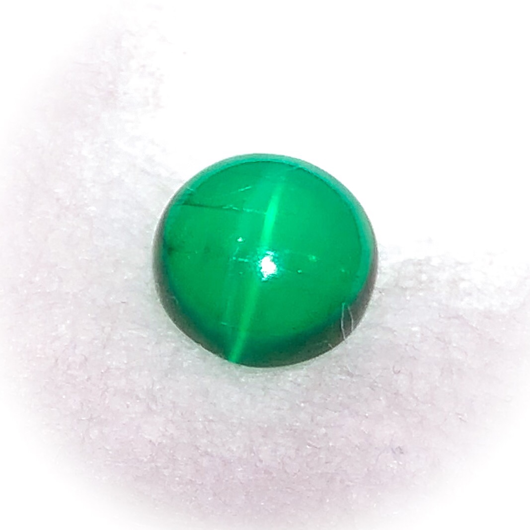 非常に稀にキャッツアイ効果が出るエメラルドがあります。光が無いときは、更に美しい濃い緑色をしていますが、光を差すと写真のように一本の線が白く光ります。