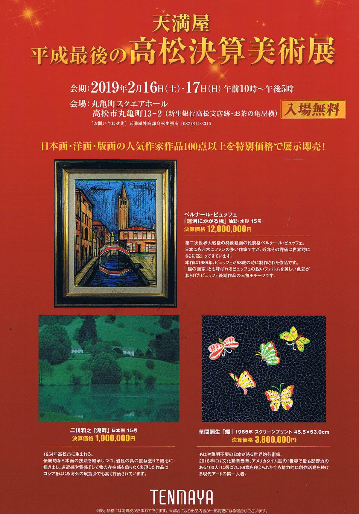 天満屋 高松決算美術展のお知らせ 2019年1月22日 by ijima 2月16日(土)~17日(日)午前10時~午後5時まで 丸亀町スクエアホール(旧 新生銀行高松支店跡)にて、 日本画・洋画・版画の人気作家作品100点以上を特別価格で展示即売いたします。 あこがれの名品を手に入れるための平成最後の特別価格です。