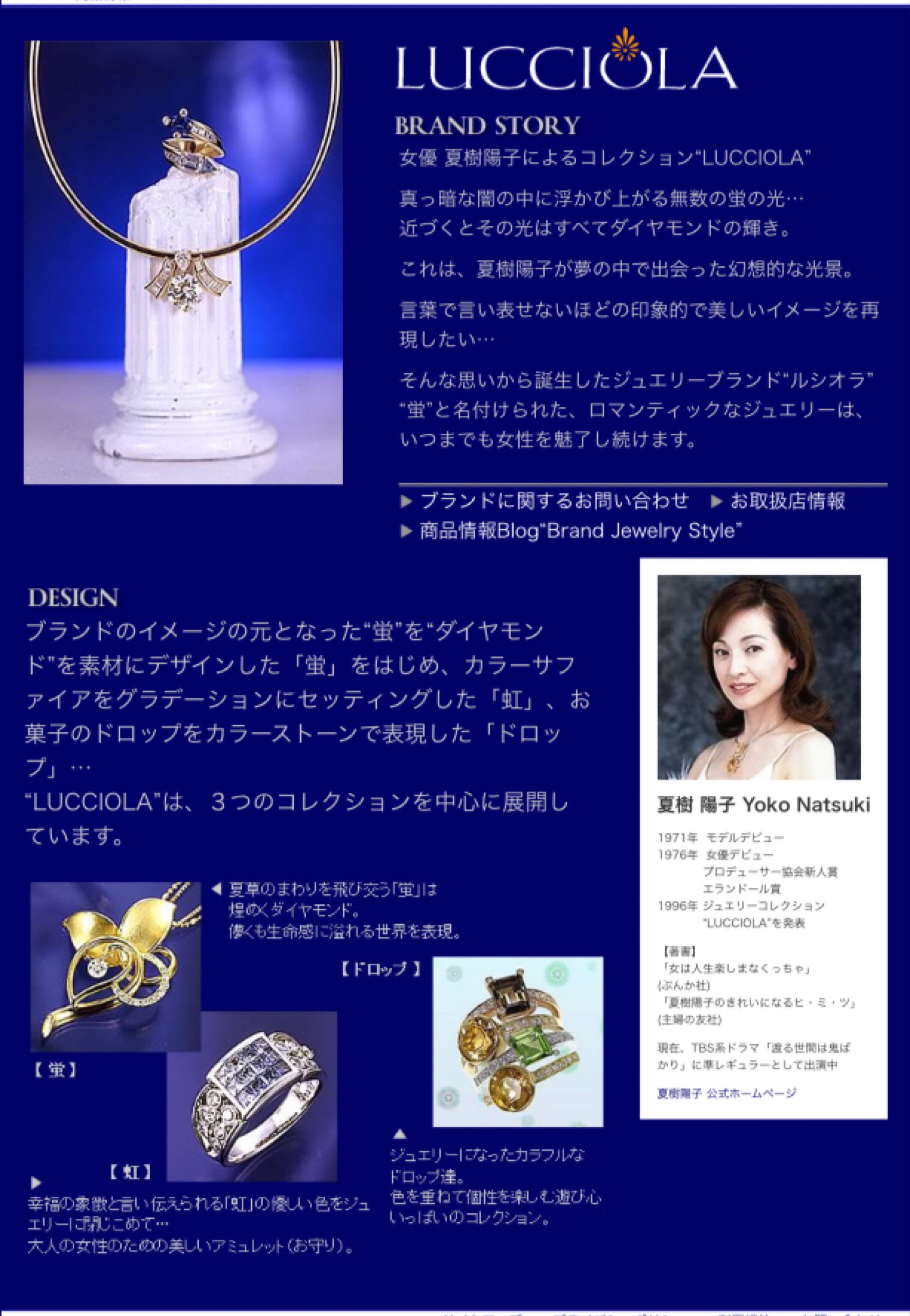 5月限定 LUCCIOLA 展開 2019年1月22日 by ijima 女優の「夏樹陽子」デザインジュエリー 「LUCCIOLA 」ルシオラはラテン語で蛍を意味します。これは以前夏樹陽子さんが夢の中で見た無数の蛍の光が全てダイヤモンドだったことに強烈な印象と言葉では言い表わせない幻想的なイメージを受けた事に由来してブランド名となりました。 5月末までメインジュエリーとして、展示いたしております。
