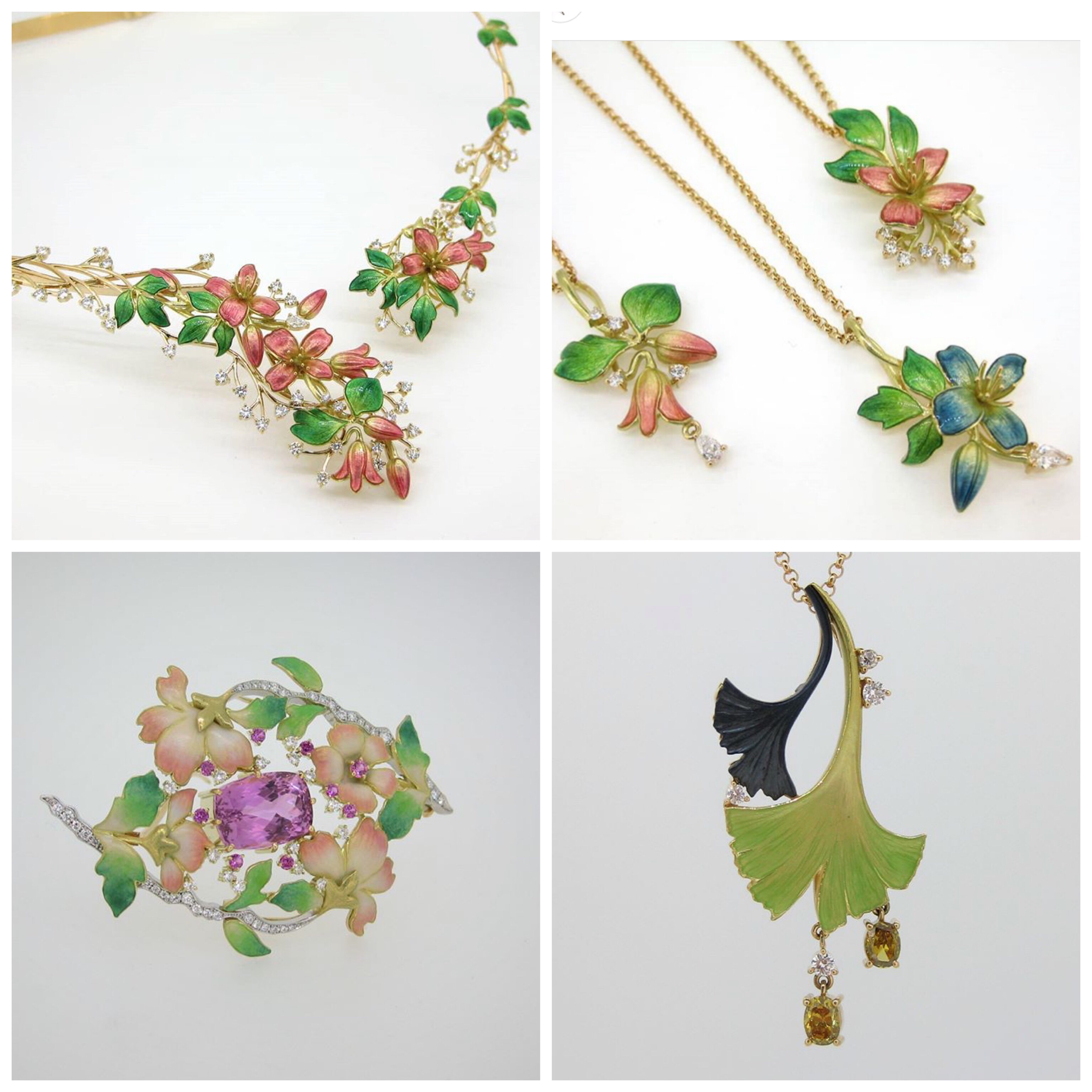 これらは、バスタイユ技法という、一般的な七宝の技法のひとつです。先生の草花に対する観察力と写実力に驚かされます。また、K18で仕上げたテクスチャーの技法の素晴らしさが、柔らかさまで感じる優しい作品になっています。