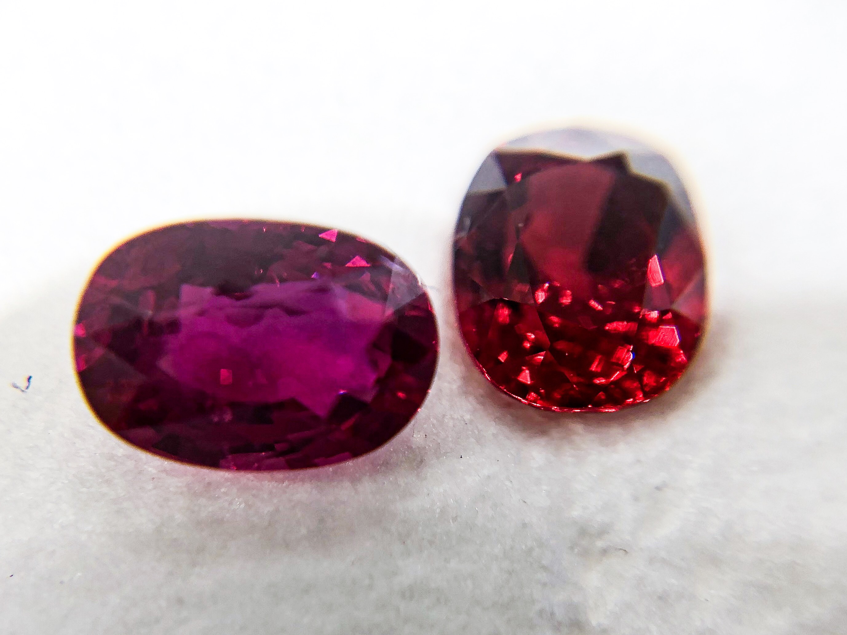 写真は「レッドスピネル」「ルビー」を並べてあります。両方とも1.2ctのオーバルカットです。ルビーは、鉱物学的には酸化アルミニウムにクロムが入り込んたもの。そして、マグネシウムが混入した鉱物がスピネルであり、これらが区別されたのは、最近の事です。