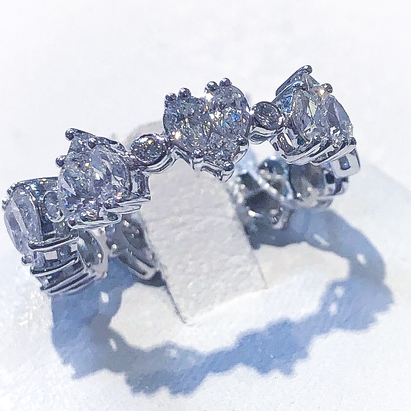 一見するとハート型の大きなダイヤモンドは、ペアシェープ2個とメレダイヤ1個の3つのダイヤモンドで合わせてセッティングされています。全周デザインが施されている高級品ですか、現品処分します。