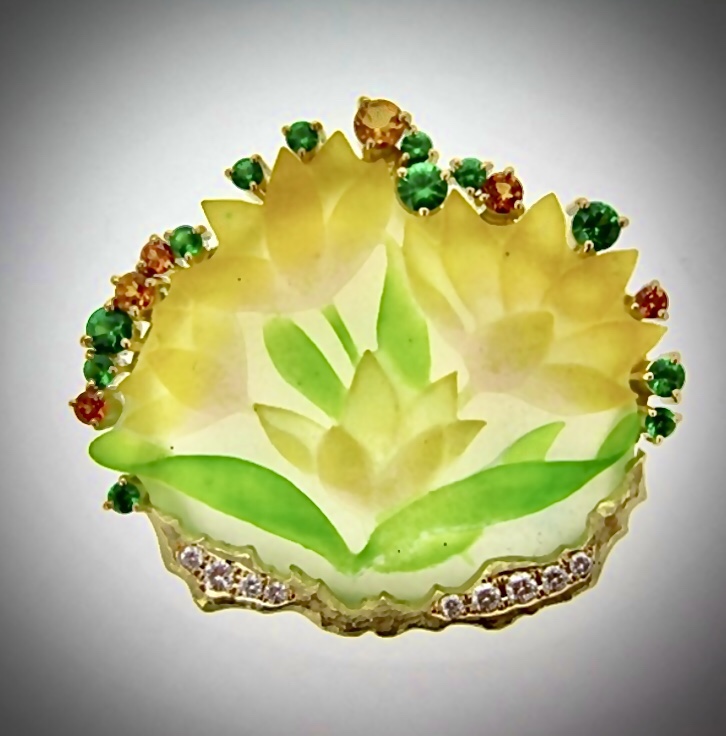 この作品も耐火石膏の中でエマイユを詰めて焼いています。色が滲んだり混ざってしまったりしないで、くっきりと、輪郭やエッジが見やすく出来上がるのは、稀だそうです。