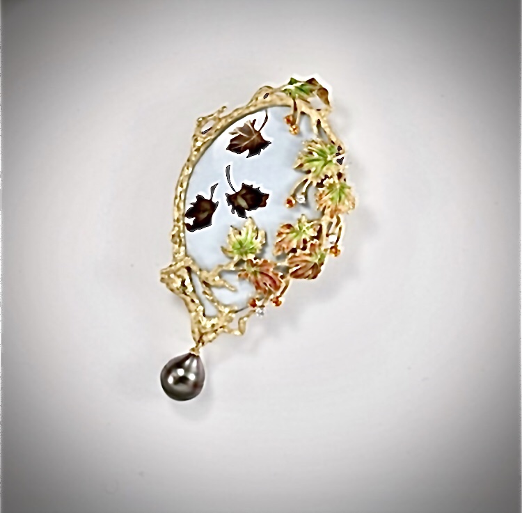 中嶋邦夫 有線七宝 2020年3月7日 by ijima 中嶋邦夫 有線七宝 プラタナス ブローチ 有線七宝の技術をジュエリーで作品にしたものは、私はこの作品以外に見たことがありません。 有線七宝は、明治11年頃から、並河靖之さんが本格的に取り組み陶器に絵画的な世界を展開し、明治22年のパリ万国博覧会で金賞を獲得した我が国に七宝工芸の素晴らしさを世界にアピールした技術です。 この技術をジュエリーの細部に描いた作品がこちらです。 この作品だけでも、手に取り観る価値はあります。