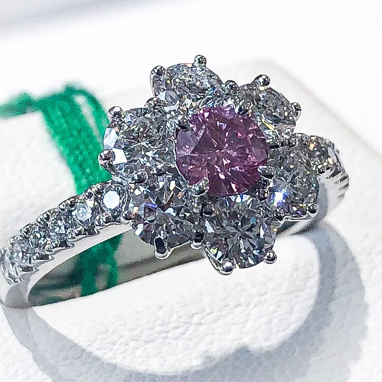 奇跡ピンクダイヤモンド③ 2020年3月25日 by ijima 0.381ct FVPP(ファンシー・ビビッド・パープルニッシュ・ピンク) I 2 脇石1.012ct/0.19ct pt900 ビビッドの鮮やかさにパープルニッシュの濃さが加わり、ほぼルビーに近い赤さを感じる。