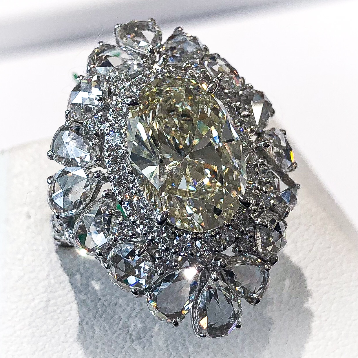 オーバルカットの5キャラアップは、迫力があります。取り巻きダイヤモンドに色が無色のオールドカットのローズダイヤモンドを配置しているため、センターが目立つようになりました。