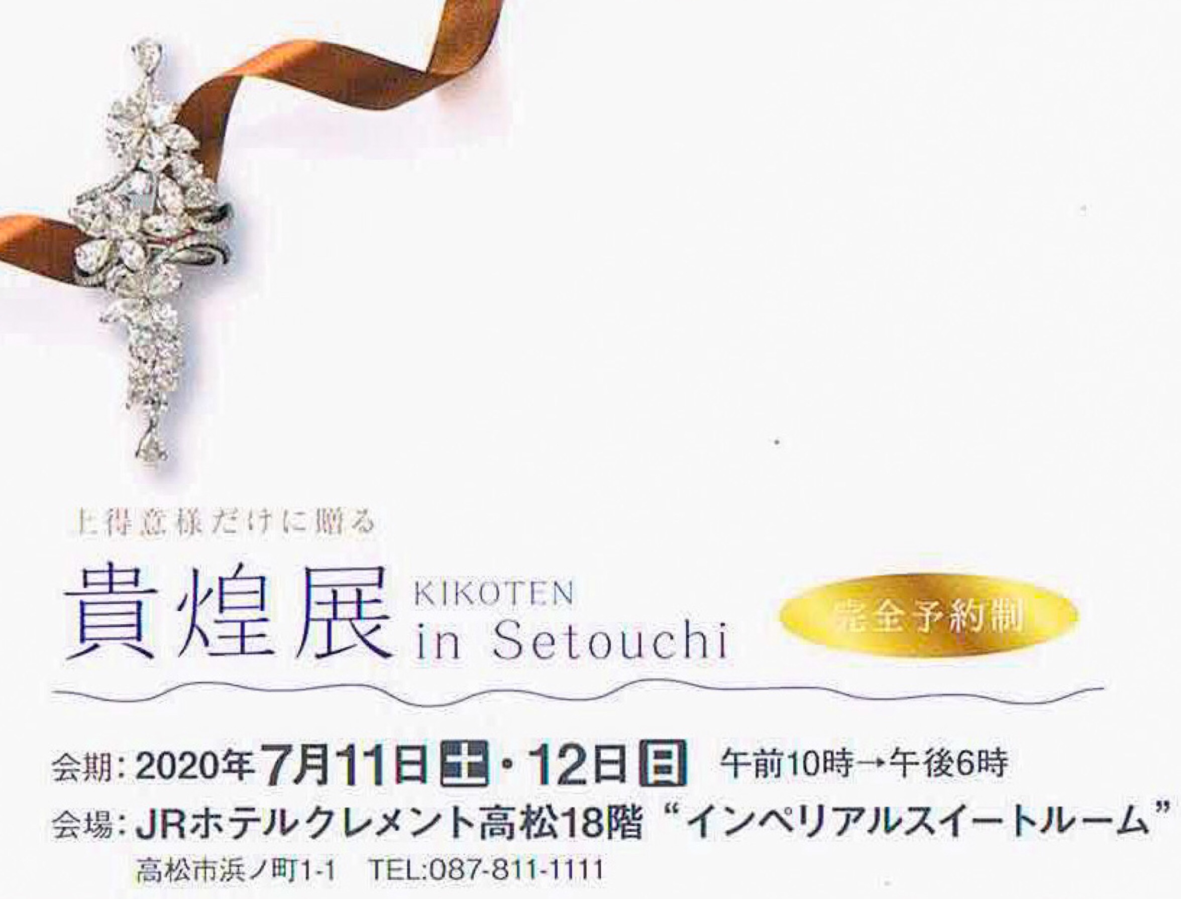 展示会予告 2019年12月20日 by ijima JRクレメントホテル高松 18階の最上級スイートルーム『インペリアルスイートルーム』での初めての宝飾展を天満屋上得意様のためだけに開催させていただくことになりました。 瀬戸内海の素晴らしい景色を一望できる贅沢な空間でごゆっくりと至福の時間をお過ごしいただけたら嬉しく存じます。 密の空間を避け、特別なお客様に極上のプライベート空間をご提供いたします。『完全予約制』とさせて頂きます。当店でご予約いただけます。