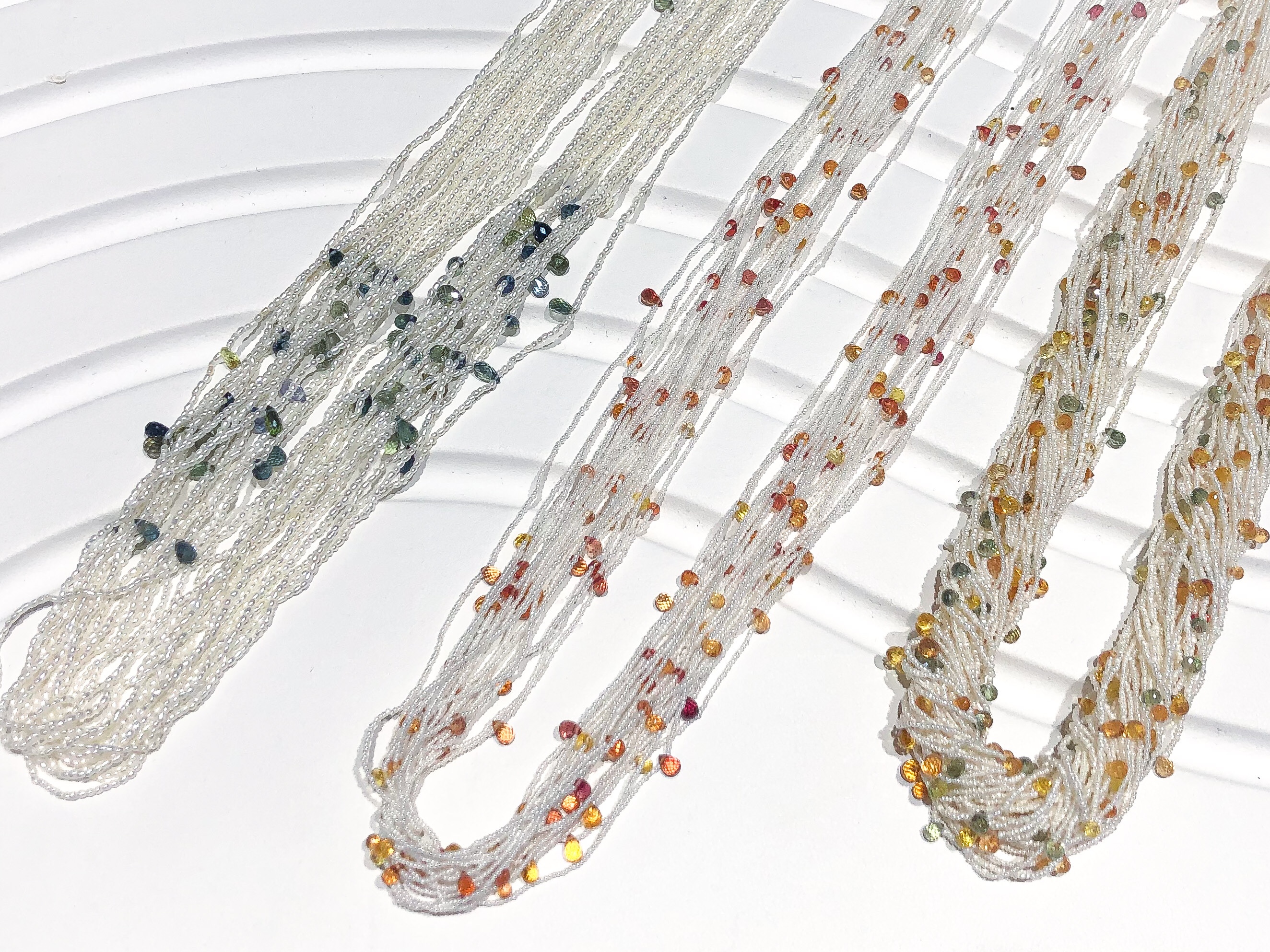 カラーサファイア ブリオレット 2020年7月10日 by ijima 昨日、紹介した最高級の『ケシ』にカラーサファイアのブリオレットカットを散らしました。 ブリオレットカットは面裏が無く、カットは、まるでシャンデリアにぶら下がるスワロのよう。レーザーで穴を開けて糸を通してあるが、端に穴を開けているので、立体感が出ています。