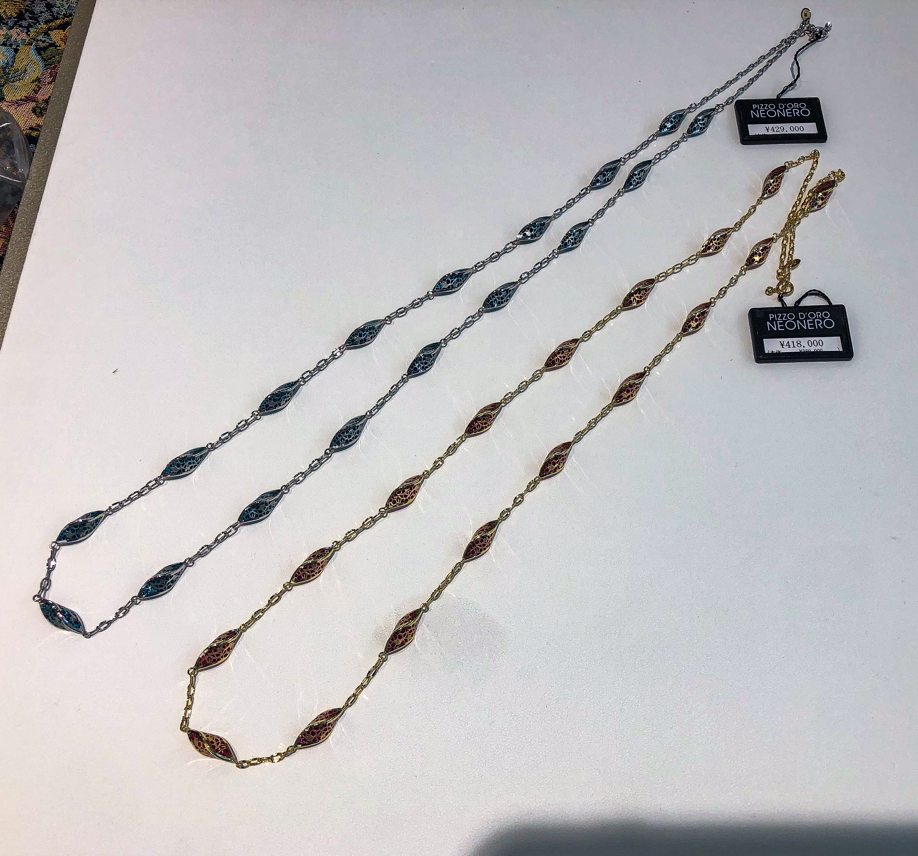 NEONERO-3 2020年7月23日 by ijima 左 ツイスト青 15.03g 80cm 429,000円 右 ツイスト赤 15.01g 80cm 418,000円 エナメルで透かしの中色を配色した鮮やかシリーズも人気です。 他にグリーンもあります。