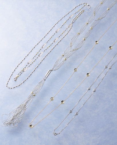 花樹海 出品商品 2015年7月13日 by ijima 花樹海 出品商品のご紹介 人気のロングネックレスを各種取り揃えました。 地金を丁寧に編んだネックレス、ダイヤをステーション式に並べたネックレス。 どれもお持ちのペンダントに重ね着けするとオシャレです。