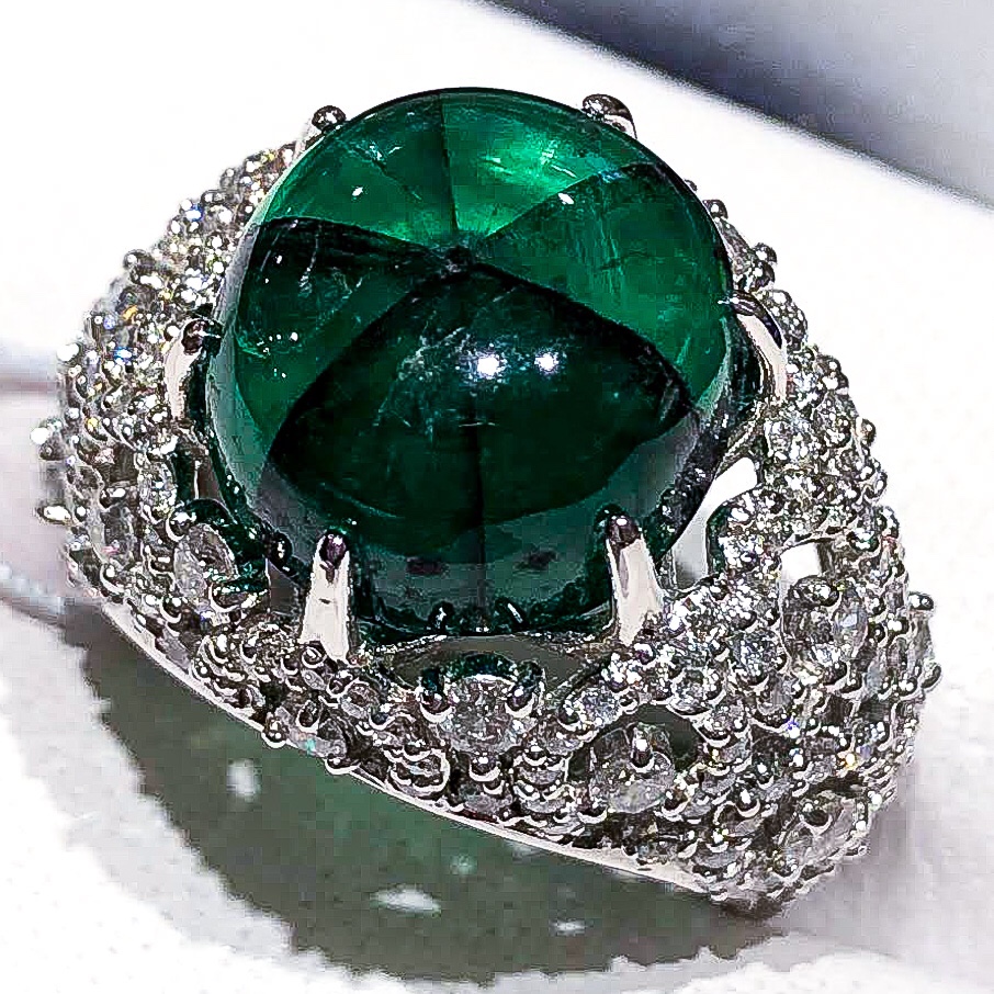 希少 トラピッチエメラルド 2020年10月19日 by ijima 9.67ct D-1.50ct コロンビア産 トラピッチエメラルド 中央から六条の成長結晶が見えます。 トラピッチとは、ブラジルでサトウキビを擦る機械の事で、その形容に似ているために命名されたと聞きます。 通常、トラピッチエメラルドは不透明だったり、不純物が混ざり濁りが多いのだが、この作品は、コロンビア産で、透明度が高く、エメラルドとしての美しさも備えています。