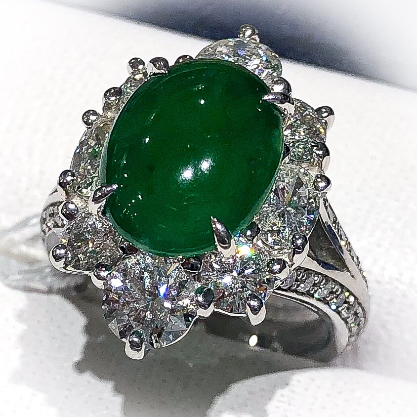 翡翠 2020年10月26日 by ijima ヒスイ 5.143ct ダイヤモンド 3.31ct 日本人女性の方に使いやすくお似合いになる適度のサイズ感のヒスイリング。 少し昨日まで紹介した最高級のヒスイに比べて緑色が濃いように見えます。 鉄分が混入すると、このような濃い緑色になるようです。 エメラルドに近い深い緑が美しく感じる方には、こちらのタイプをお勧めします。