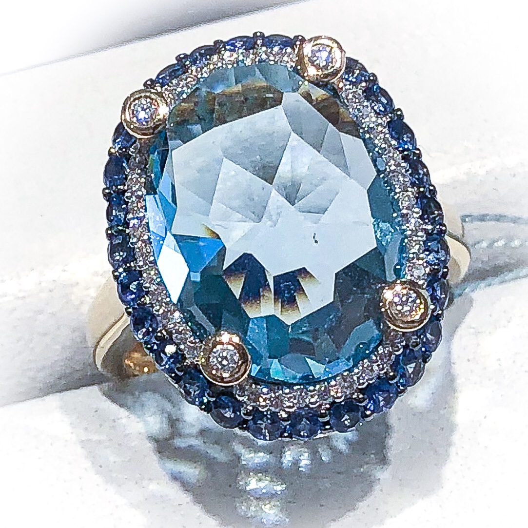 センター:12.05ctのブルートパーズの周りにダイヤモンド、そして、その周りにサファイアを0.89ctをセッティングしてあります。