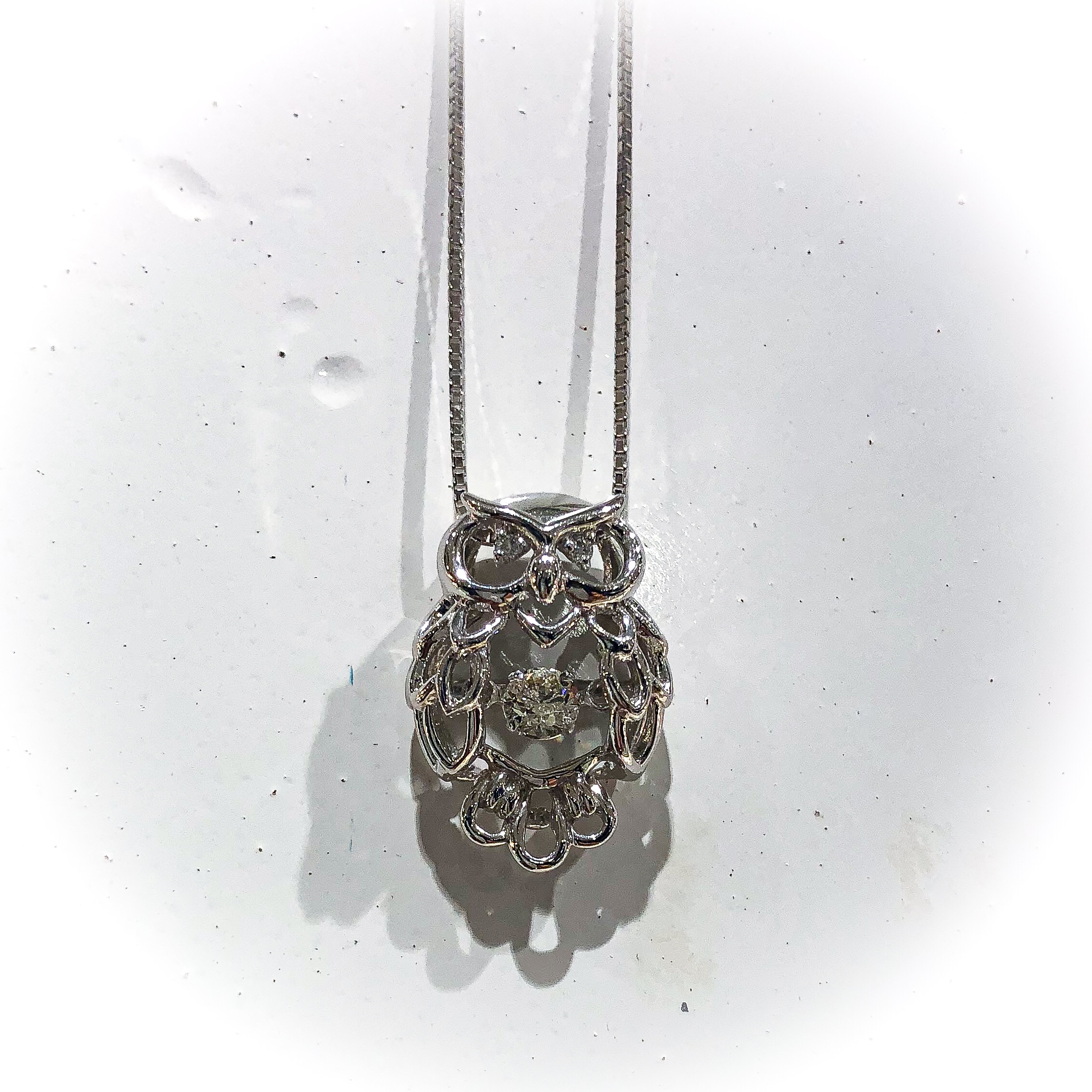 フクロウペンダント 2020年11月17日 by ijima K18WG フクロウ 苦労知らず、老い知らず、など護り神として珍重され、親しまれている「フクロウ」をペンダントにしてみました。 お腹のダイヤモンドは2点留めで、常に揺れるようになっています。 税込15万円