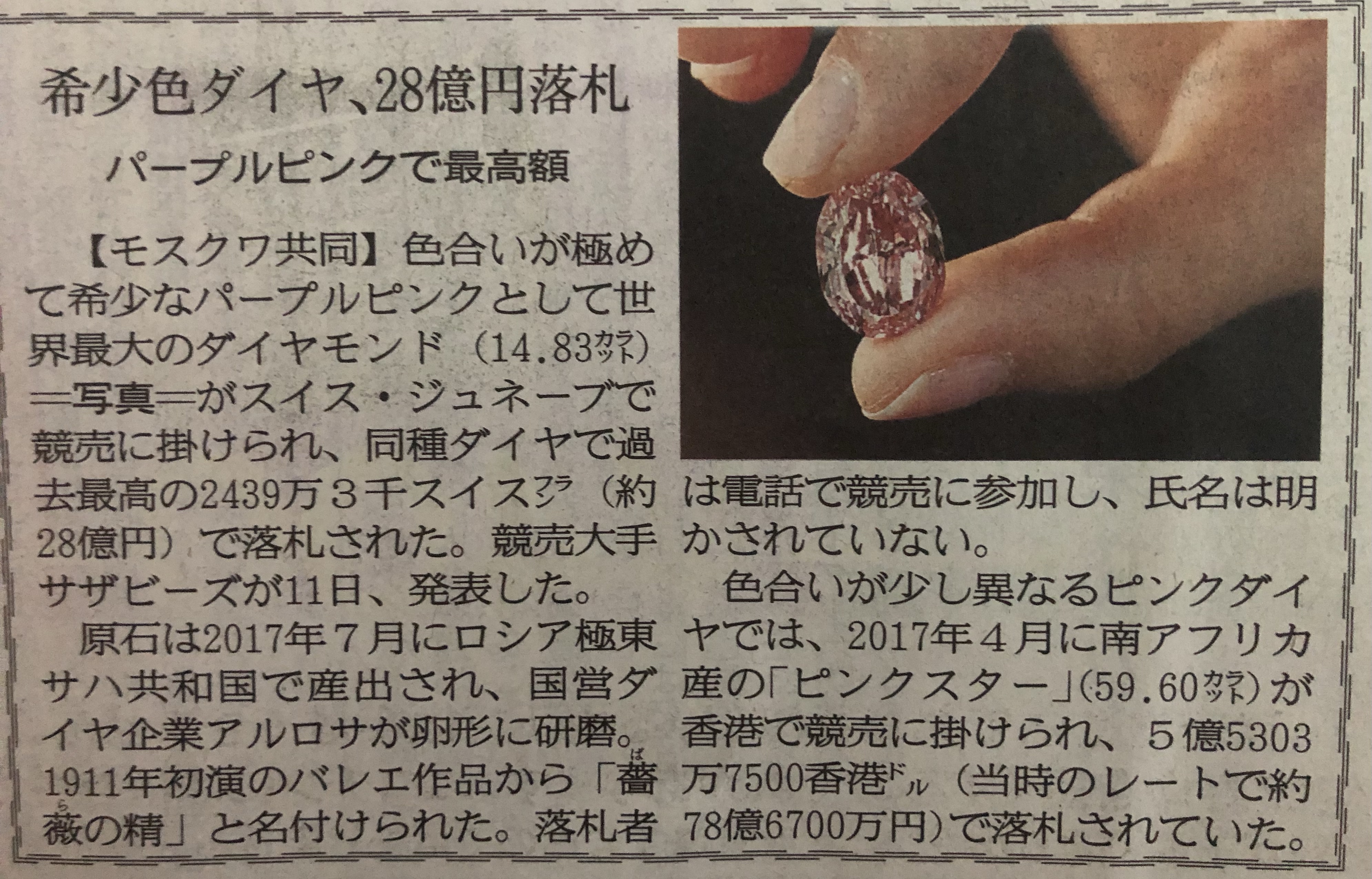 14ct ピンクダイヤモンド落札 2020年11月19日 by ijima パープルピンクの極めて濃い14ctのダイヤモンドがオークションで28億円で落札されました。 四国新聞より オーストリアのアーガイル鉱山は今年で産出を辞めて閉山するので、ピンクダイヤモンドの価値はどんどん高くなってきています。 今後も注目のアイテムですね