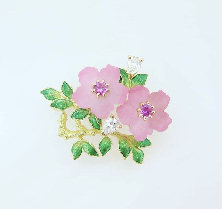 エマーユジュエリー 2020年12月19日 by ijima パートドヴェールという幻の技法で見事に再現された立体のさくら花弁。 ピンク色も優しく透き通る光で色変わりも楽しめます。枝ぶりや葉々は、彫金技術の細心技法ですね。 明日の展示会で是非、直接、先生から製作の裏話などを聴いてみてください。