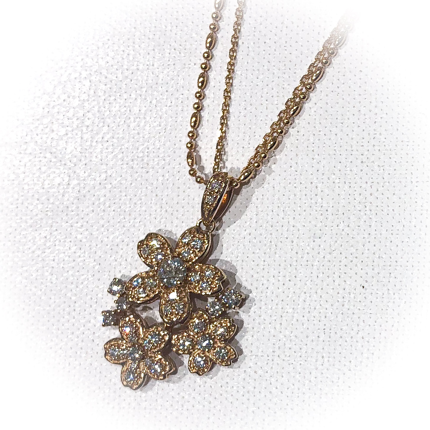 サクラ咲く 2021年2月15日 by ijima サクラダイヤペンダント 受験生の皆さんには「サクラ咲く」ペンダントで、運気を上げてほしいものです。 サクラのは花弁は可愛いハート型なんですね。 K18PG で可愛らしさが一段とアップしています。 センターのサクラダイヤは、0.158ct K VS2を使用しています。脇石は、0.42ct 定価473,000円 2月末まで、30%OFF