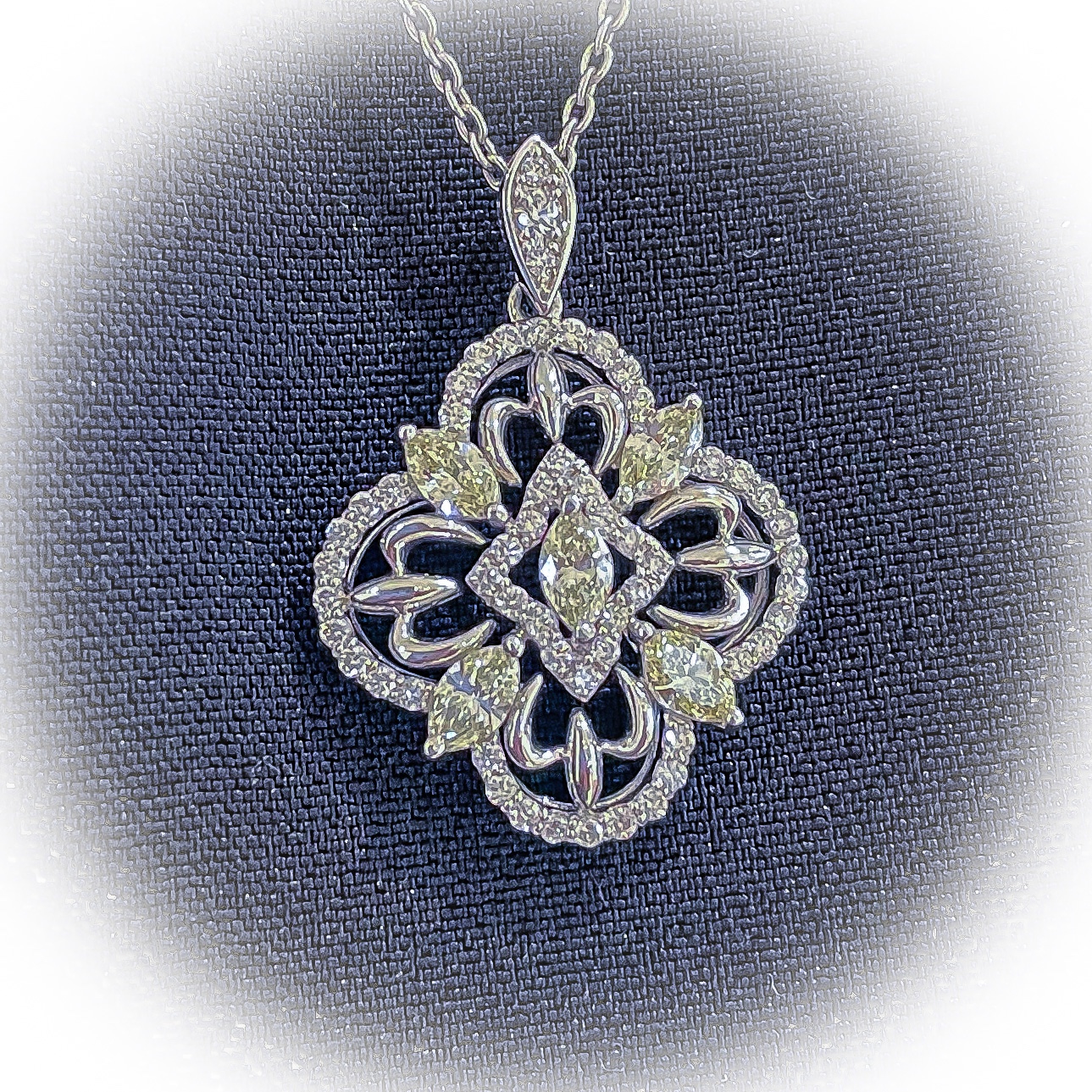 イエローダイヤモンドペンダント 2021年5月17日 by ijima Pt ダイヤモンドクローバーペンダント0.57ct 0.35ct 四つ葉のクローバーをモチーフにした縁起のいいデザインです。 中はユリの紋章で透かしデザインにしてアンティークな雰囲気を出しています。 白っぽく、見えるのを防ぐためにイエローダイヤモンドでアクセントをつけています。 ボリューム感あるクラシックな逸品です。 価格は 税込み 352,000円