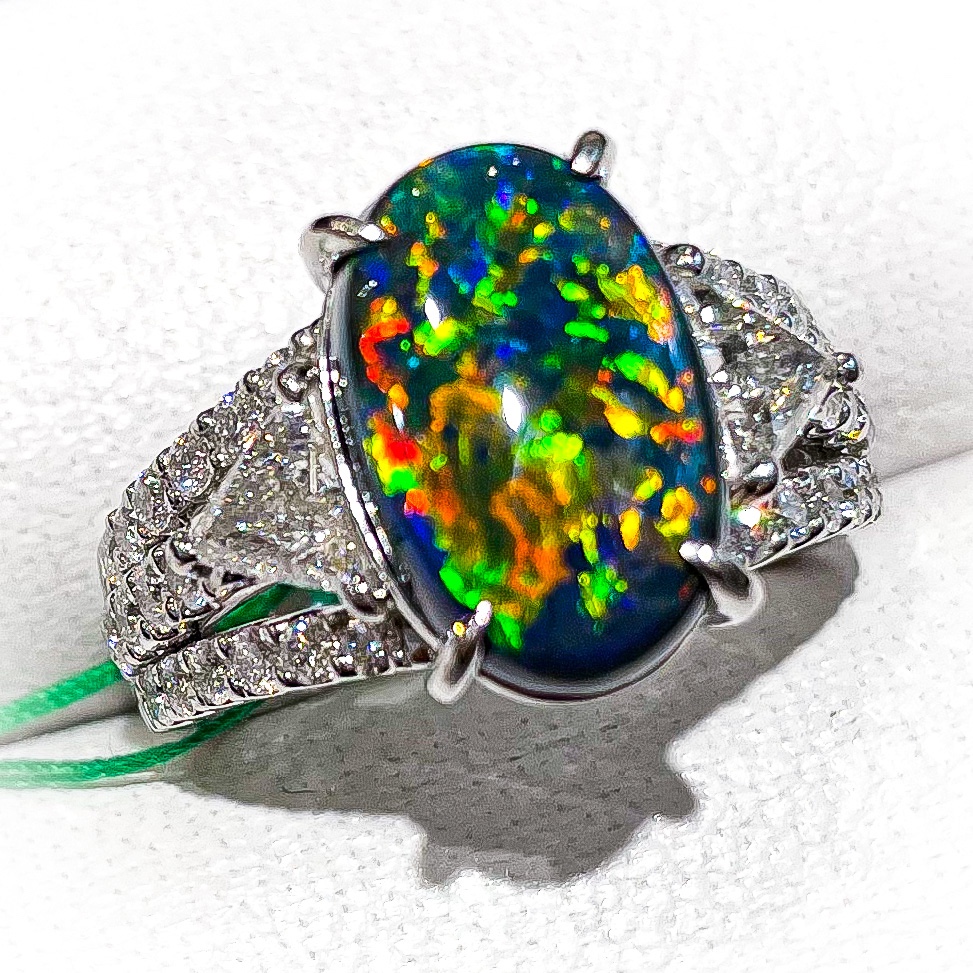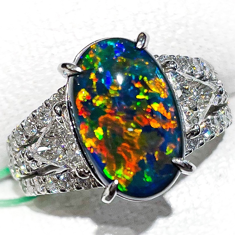 ブラックオパール 2021年6月11日 by ijima ブラックオパール ブラックオパール 敢えて角度を替えて撮った写真を掲載しました。もちろん同じブラックオパールなんですが、色や標準が違います。 ブラックオパールの価値は、色合いの多さと、それぞれのパートカラーの大きさ。 細かいパターンのピンファイアーと呼ばれて価値の高いものがありますが、やはり、この石のような、貼り絵をしたようなパターンが希少で人気が高い。 中石 4.36ct 脇石ダイヤモンド 1.30ct